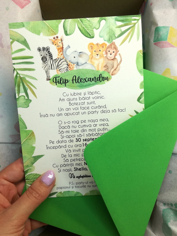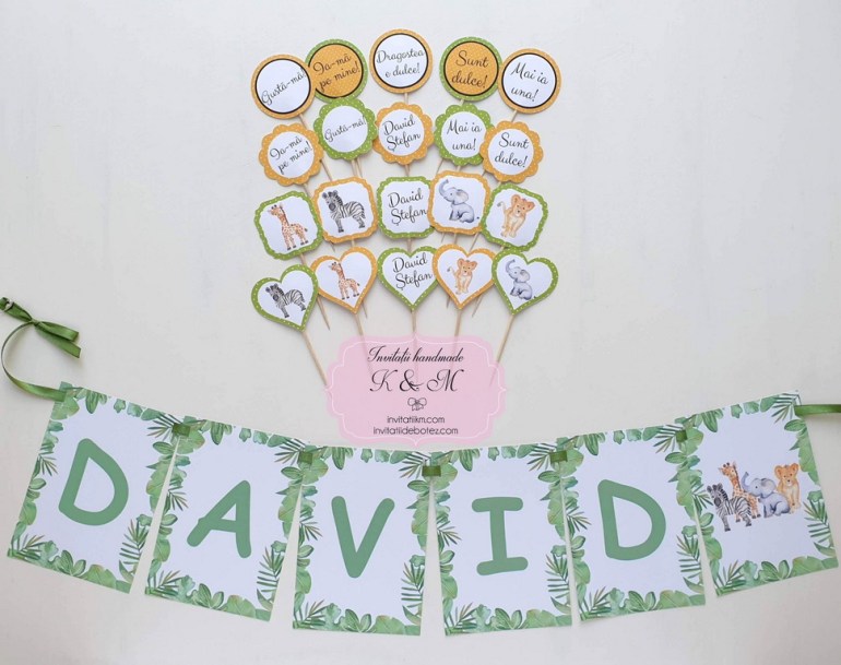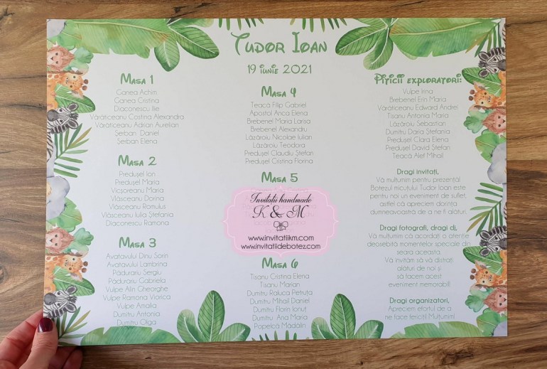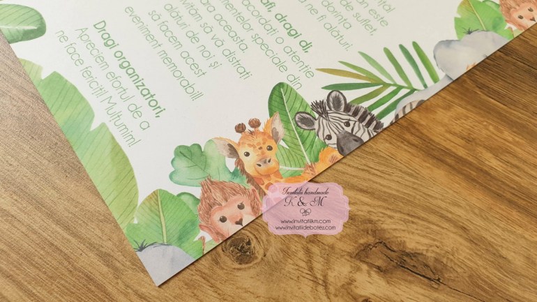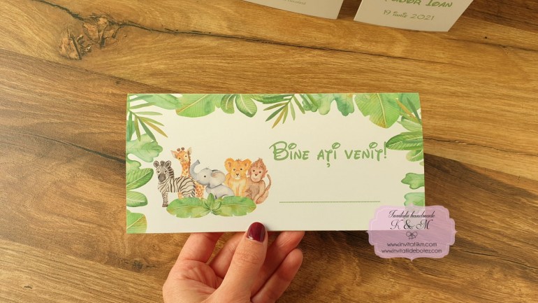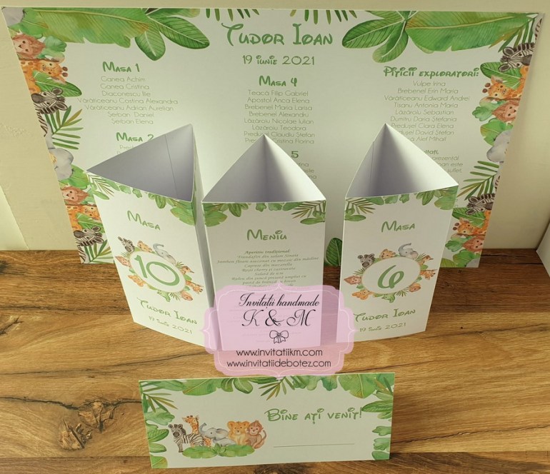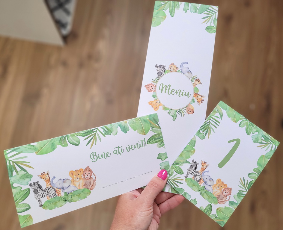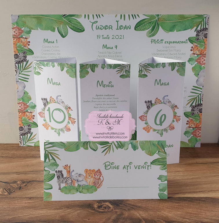 Meniuri, plicuri bani, numere masa, lista asezare invitati la mese cu animalute din jungla si verdeata