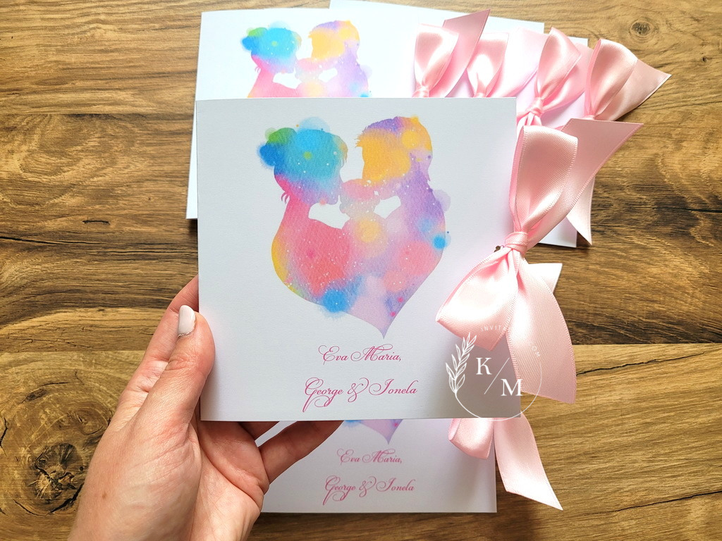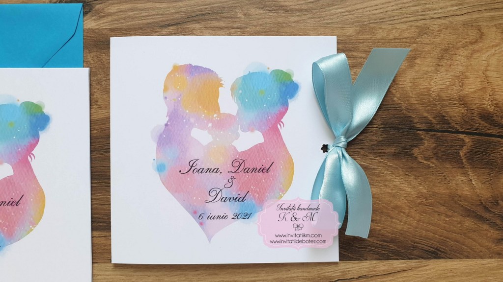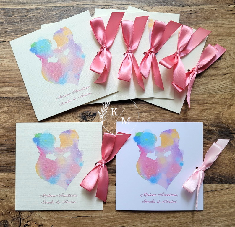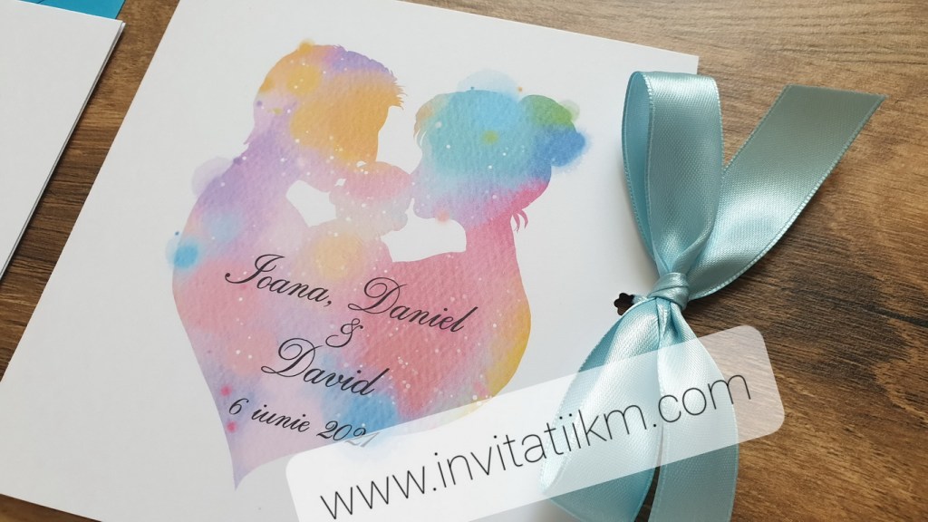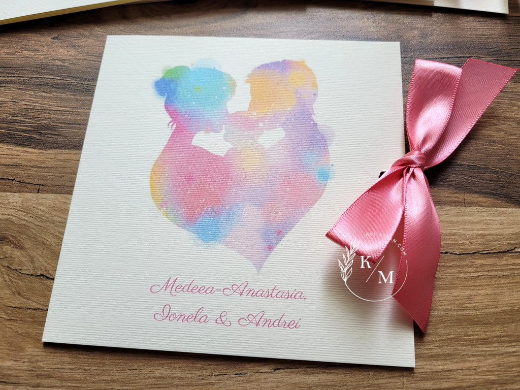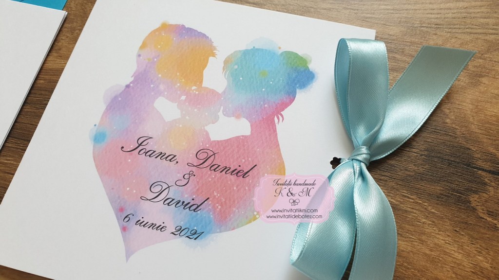 Invitatii de nunta si botez 2 in 1 cu miri si bebelus, realizate din carton alb/ivory, accesorizate cu plic sau cu fundita satinata