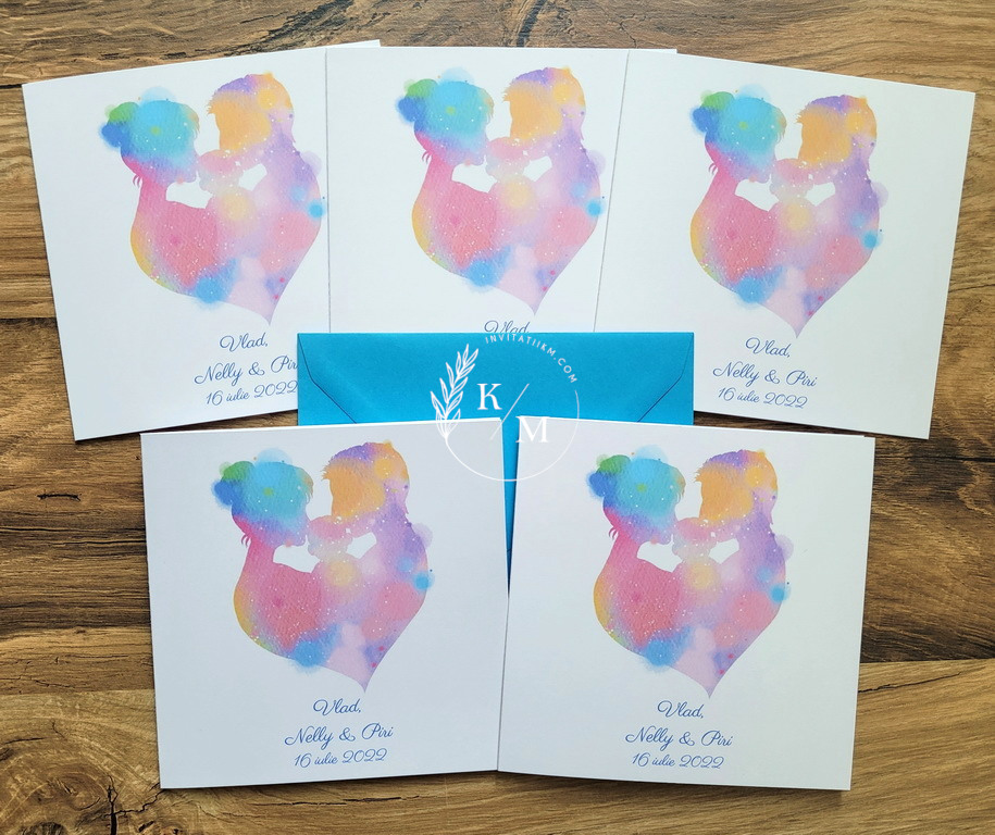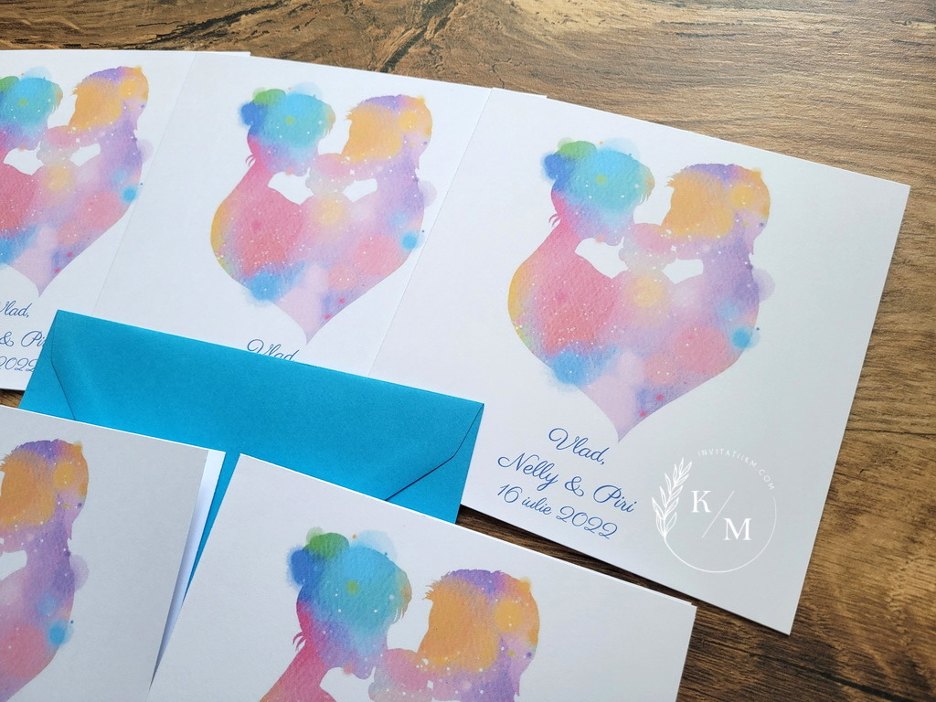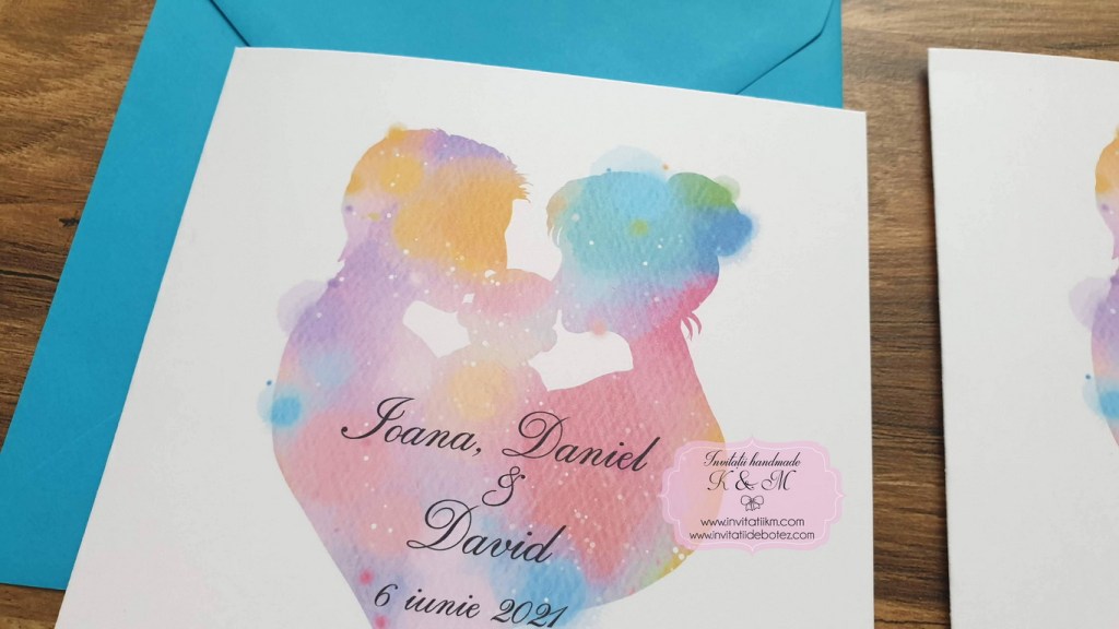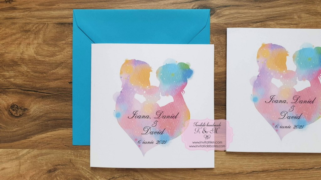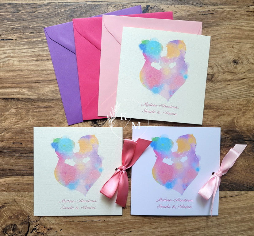 Invitatii de nunta si botez 2 in 1 cu miri si bebelus, realizate din carton alb/ivory, accesorizate cu plic sau cu fundita satinata