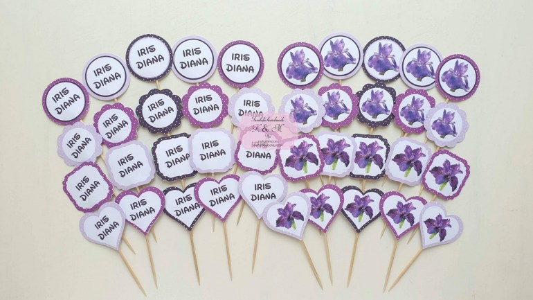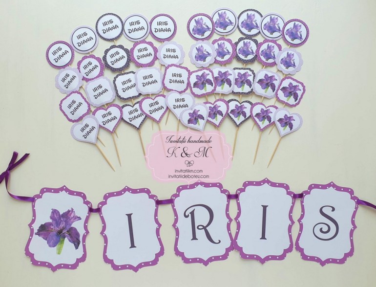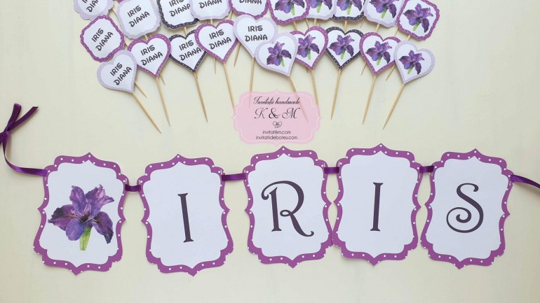Plicuri de bani/carduri de asezare handmade cu floare de iris mov si mesaje/propsuri mici pentru candy bar si litere ghirlanda cu iris si nuante de mov