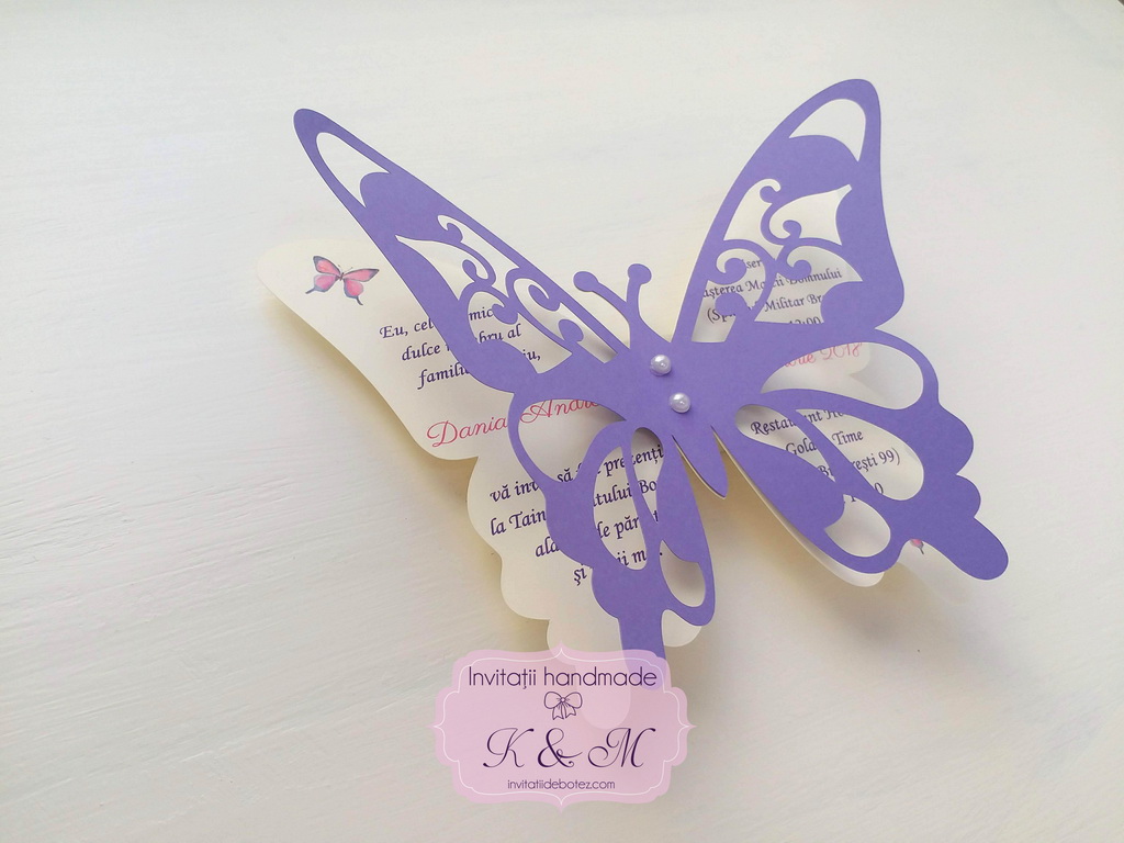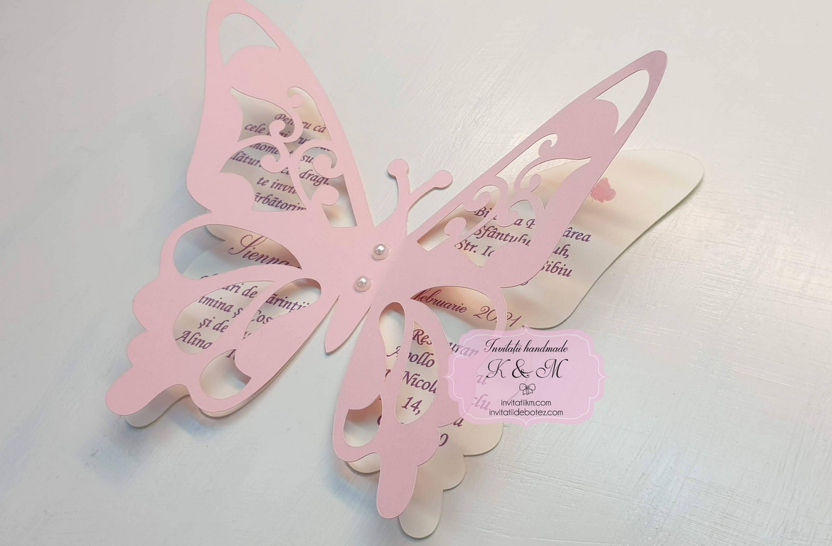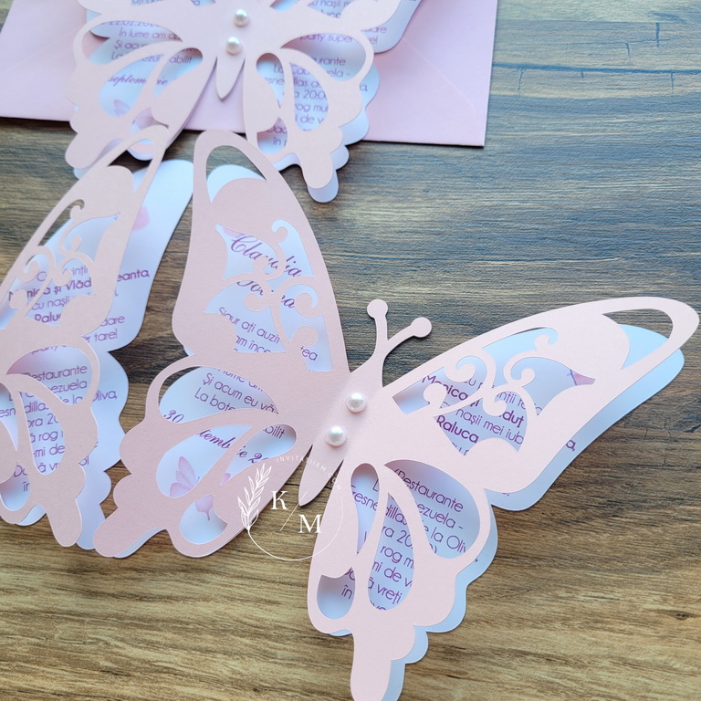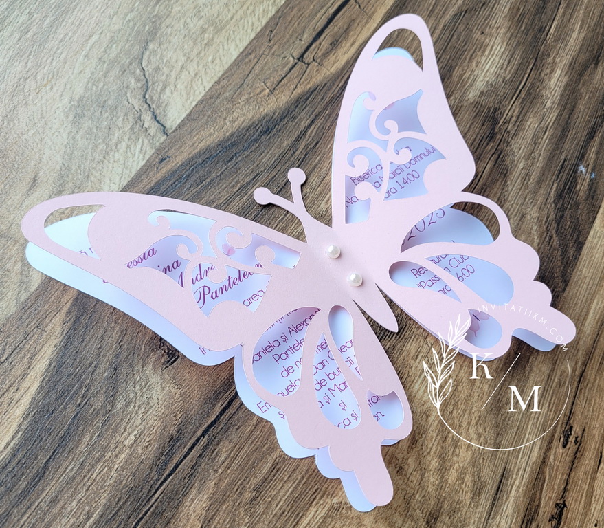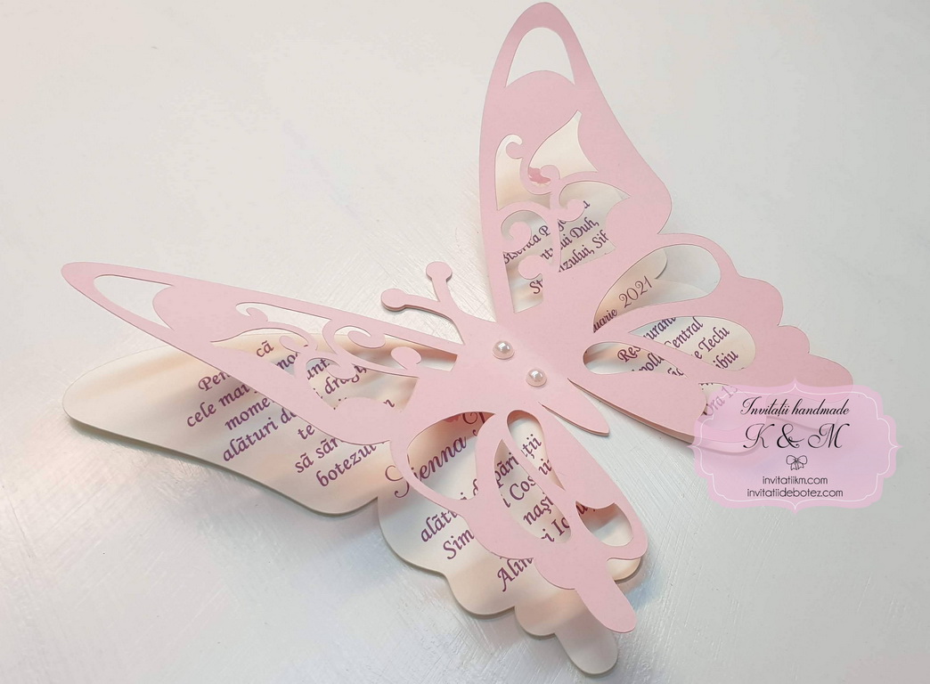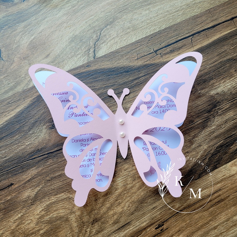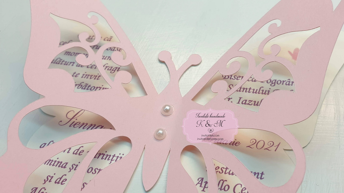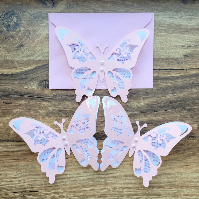 Invitatie de botez realizata din doi fluturasi decupati si lipiti intre ei. Este accesorizata cu doua perle ivory. Contine plic asortat, iar stickerul pentru plicuri este optional.