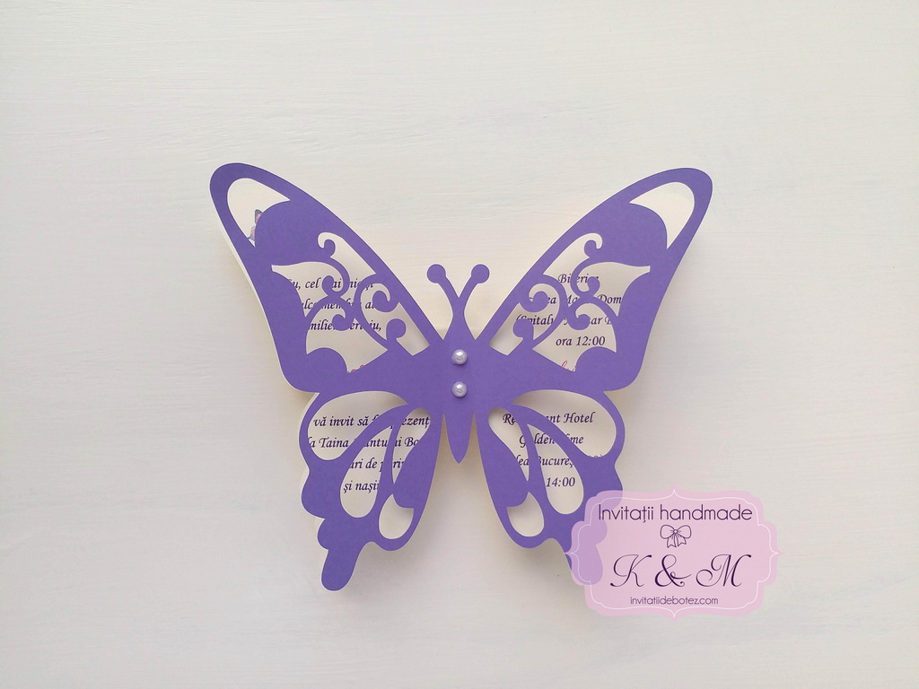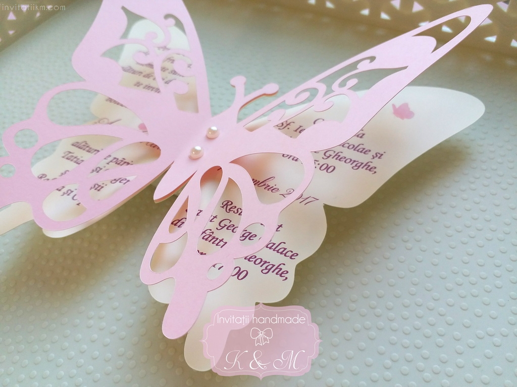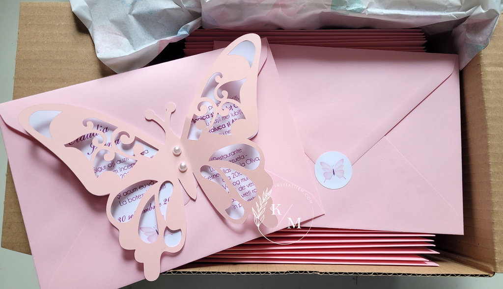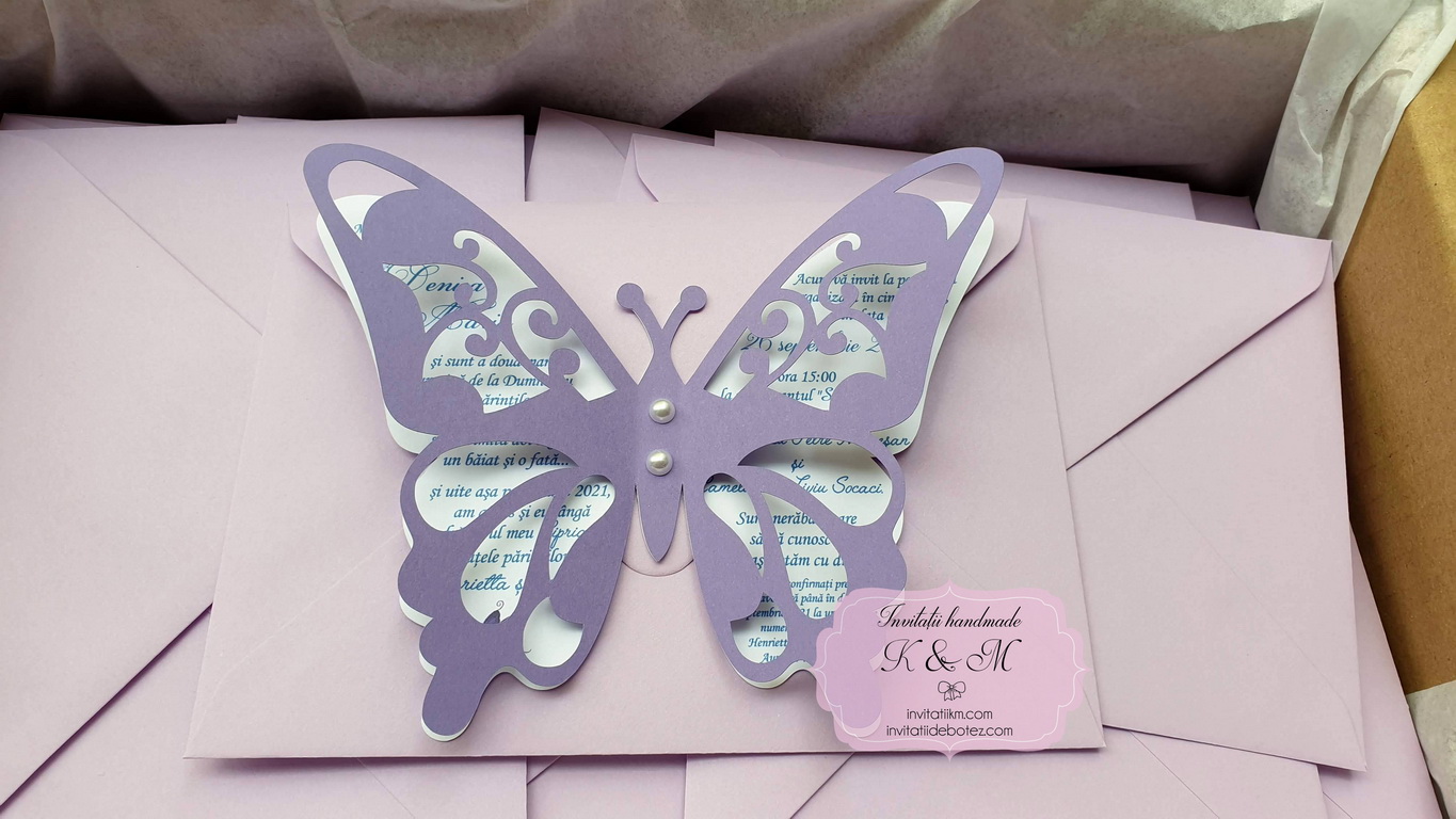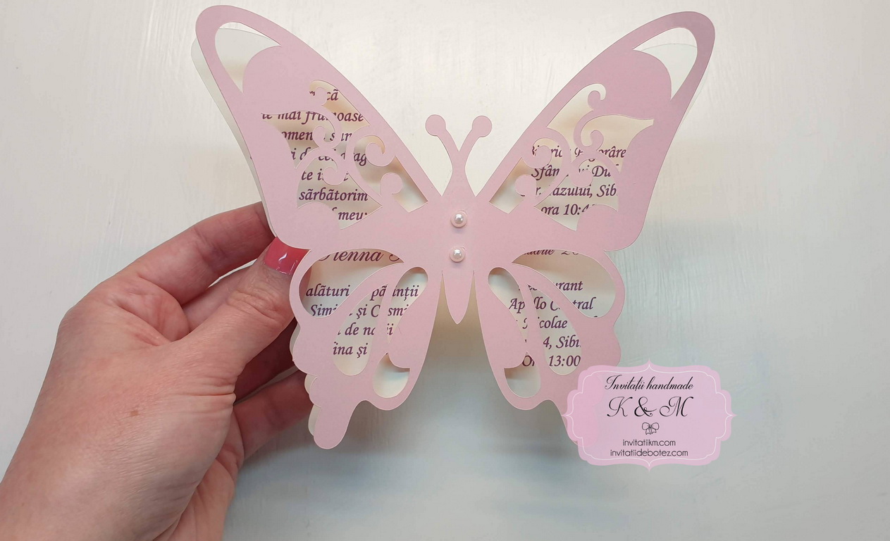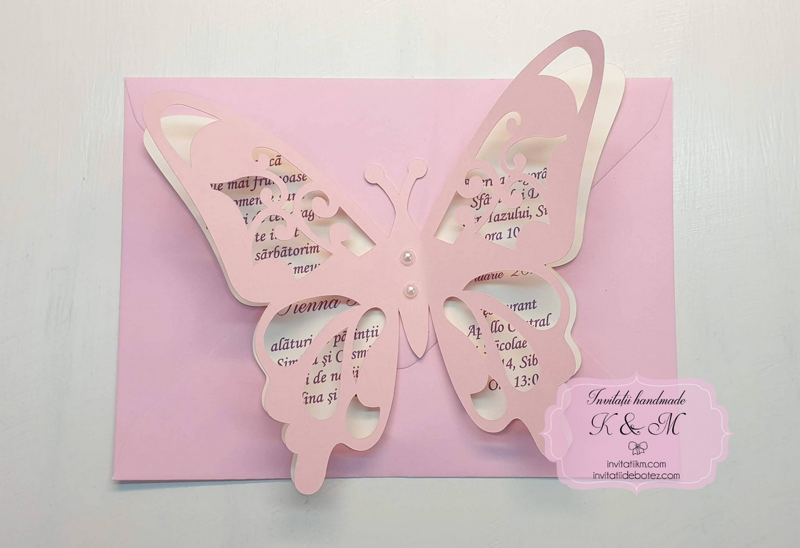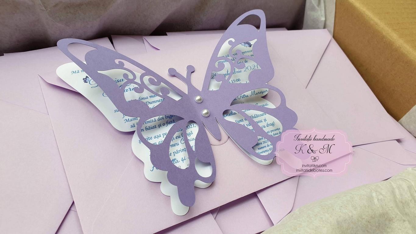 Invitatie de botez realizata din doi fluturasi decupati si lipiti intre ei. Este accesorizata cu doua perle ivory. Contine plic asortat, iar stickerul pentru plicuri este optional.