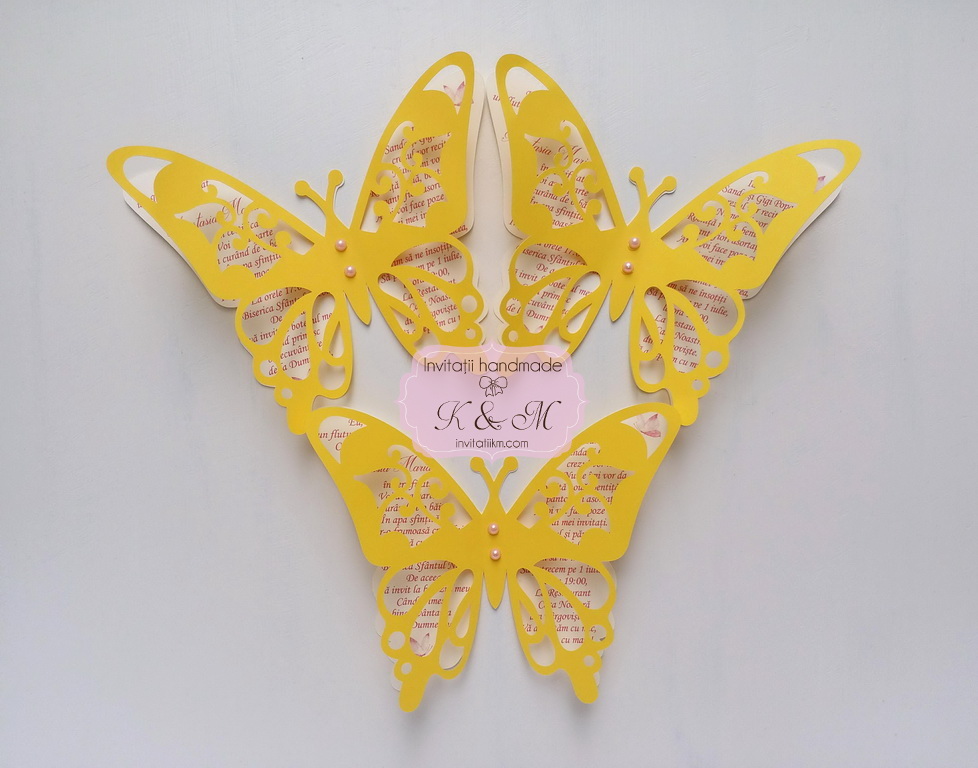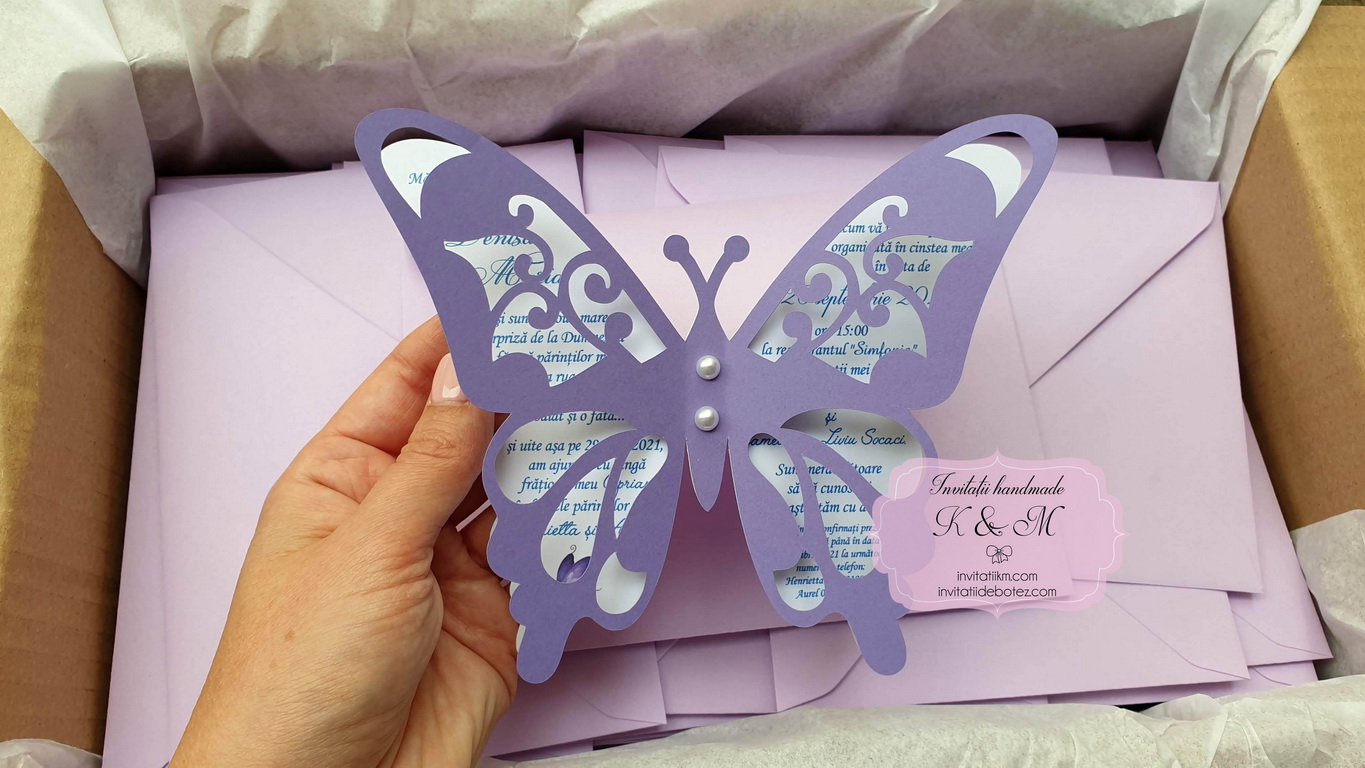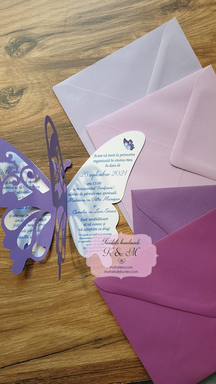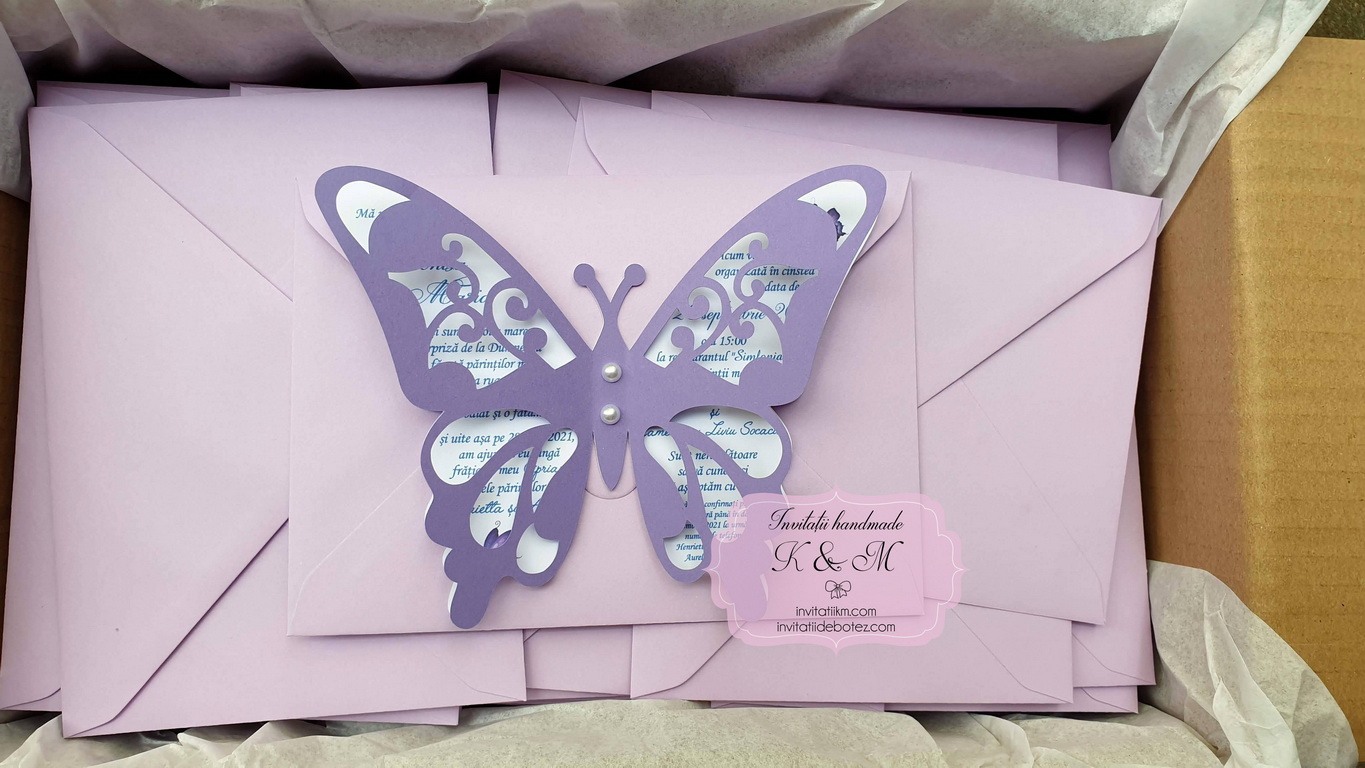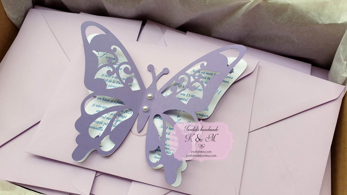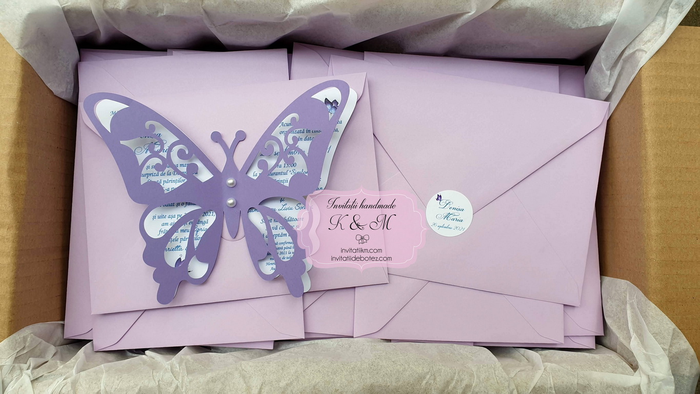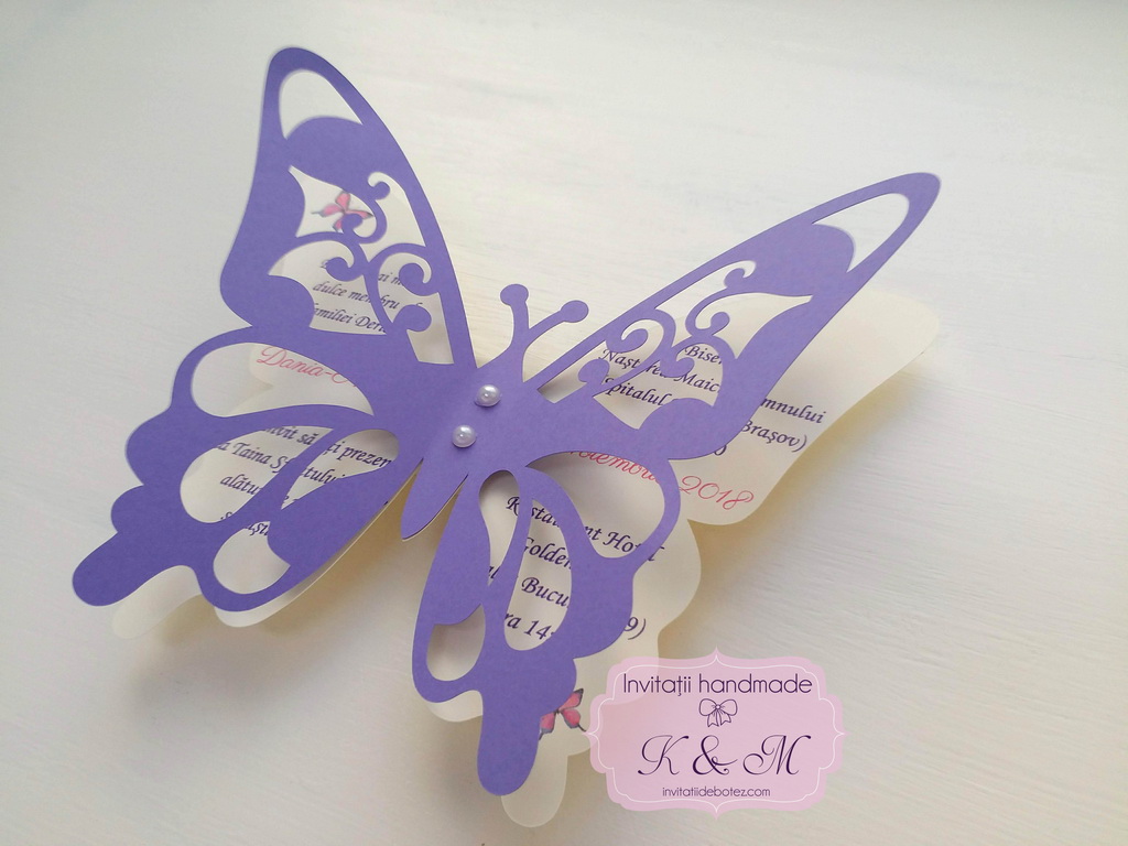 Invitatie de botez realizata din doi fluturasi decupati si lipiti intre ei. Este accesorizata cu doua perle ivory. Contine plic asortat, iar stickerul pentru plicuri este optional.
