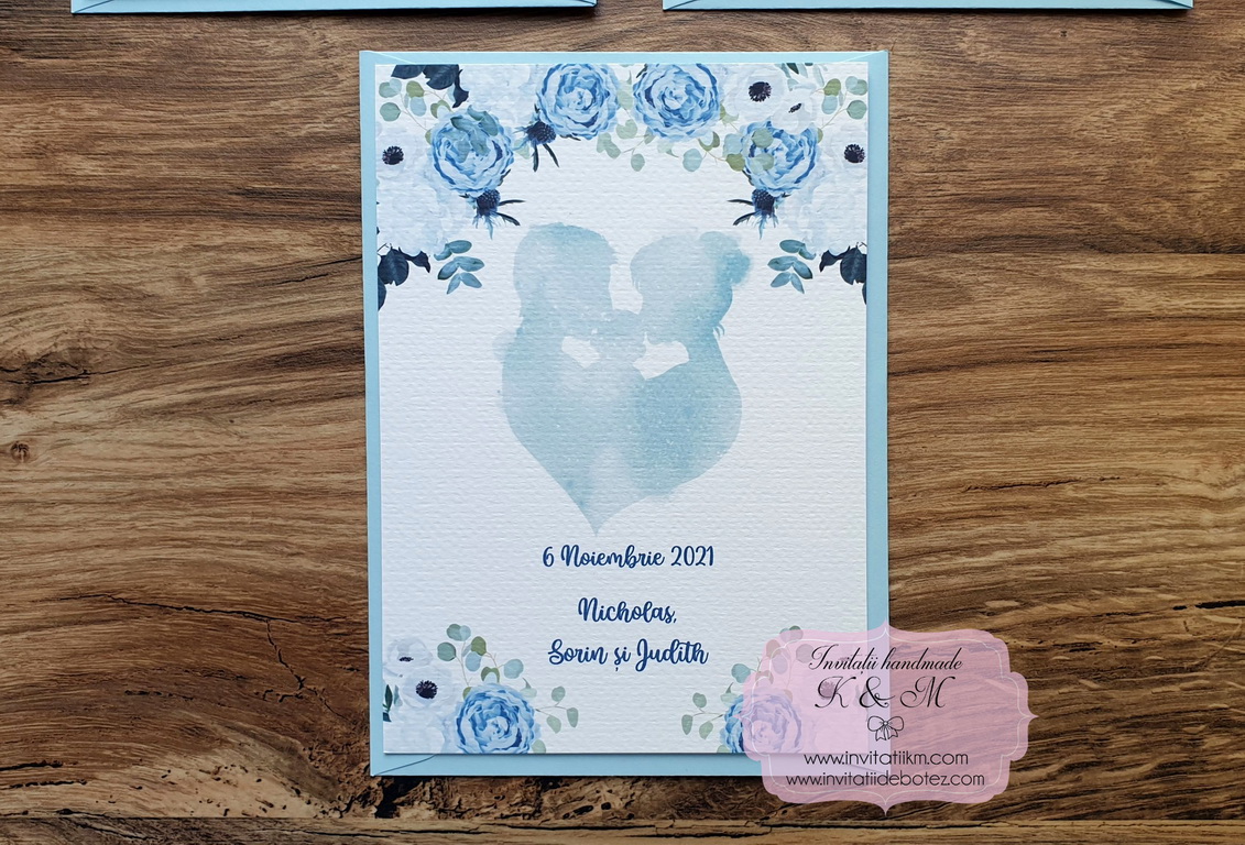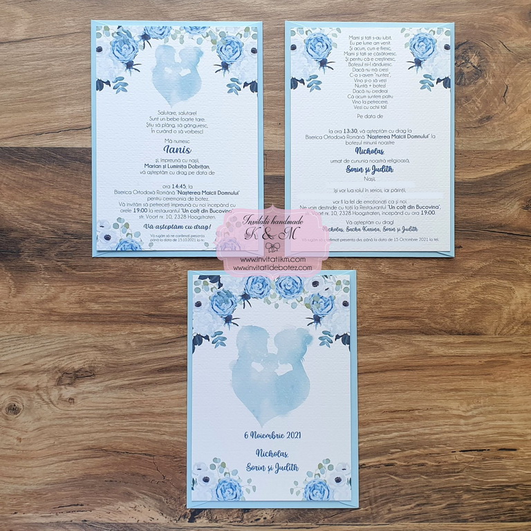 Invitatii de nunta si botez 2 in 1 cu miri si bebelus, realizate din carton alb/ivory, accesorizate cu plic asortat, cu print fata-verso