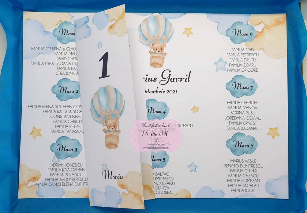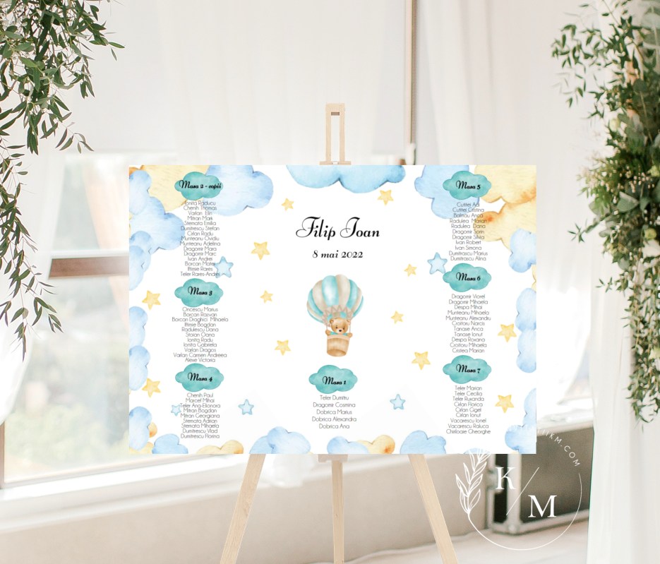 Lista de asezare a invitatilor la mese cu ursulet in balon cu aer cald, nori si stelute. La plasarea comenzii, va rugam sa specificati daca doriti format digital sau printat.