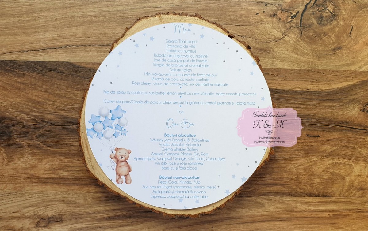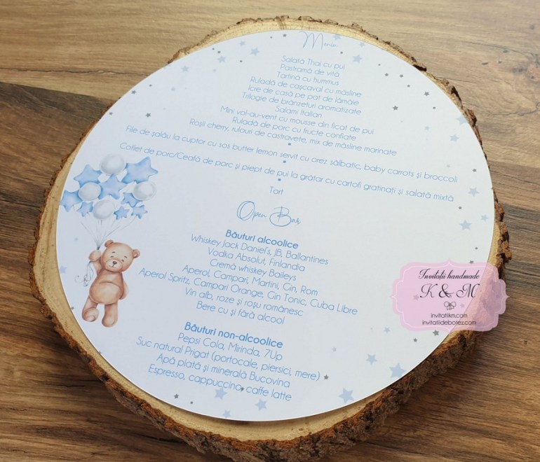 Meniuri individuale rotunde pentru nunta/botez realizate din carton. Meniul poate fi asezat pe fiecare farfurie
