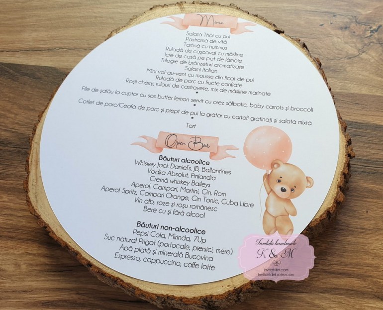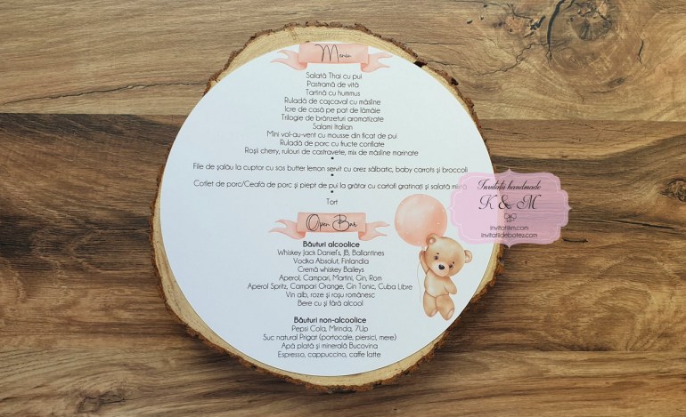 Meniuri individuale rotunde pentru nunta/botez realizate din carton. Meniul poate fi asezat pe fiecare farfurie