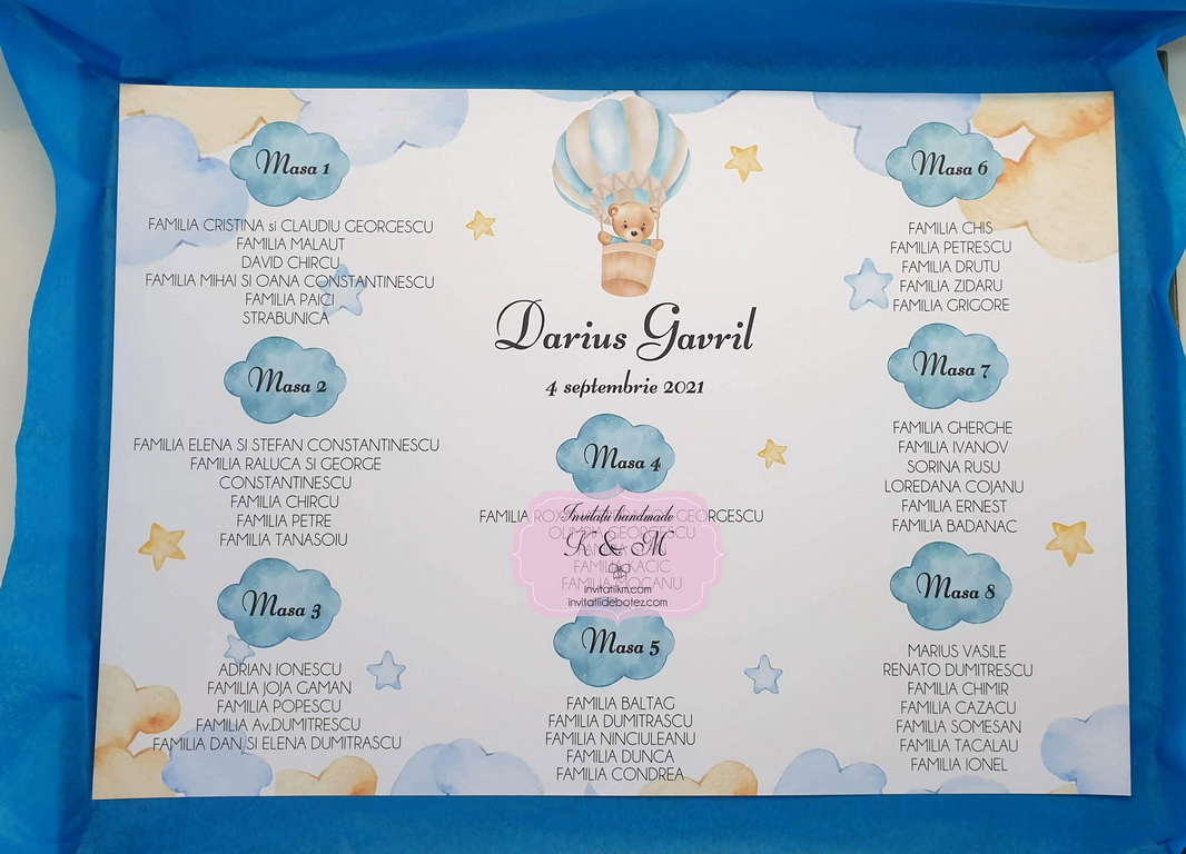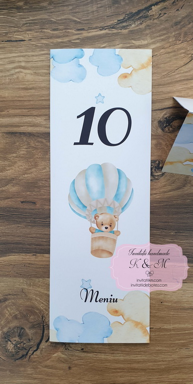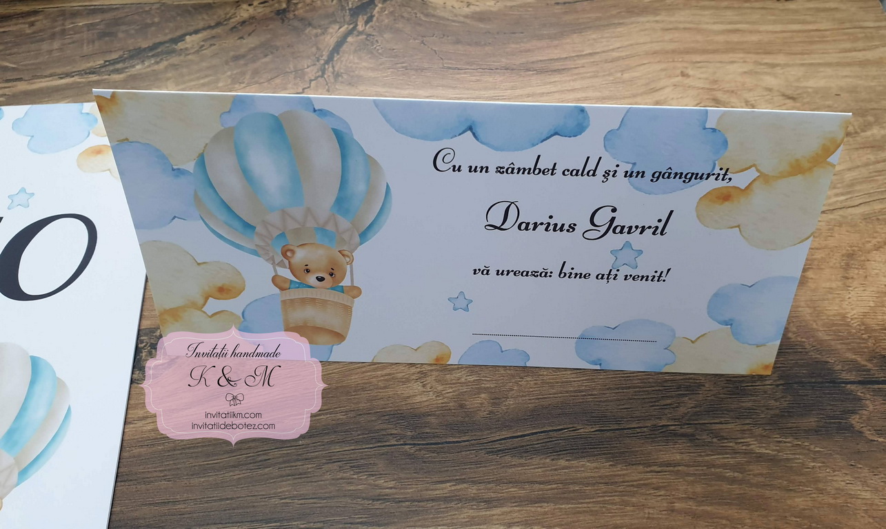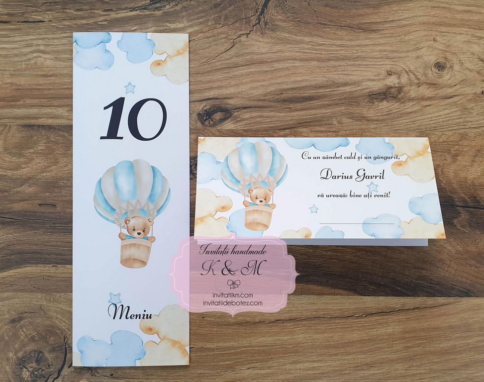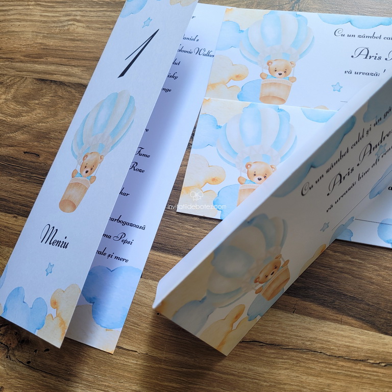 Papetarie/meniuri, plicuri de bani, lista de asezare la mese A3 cu nori si ursulet in balon cu aer cald