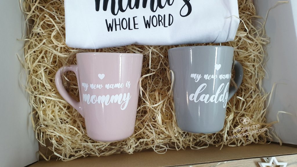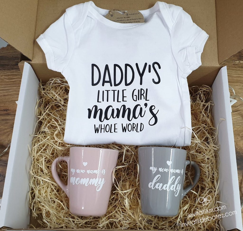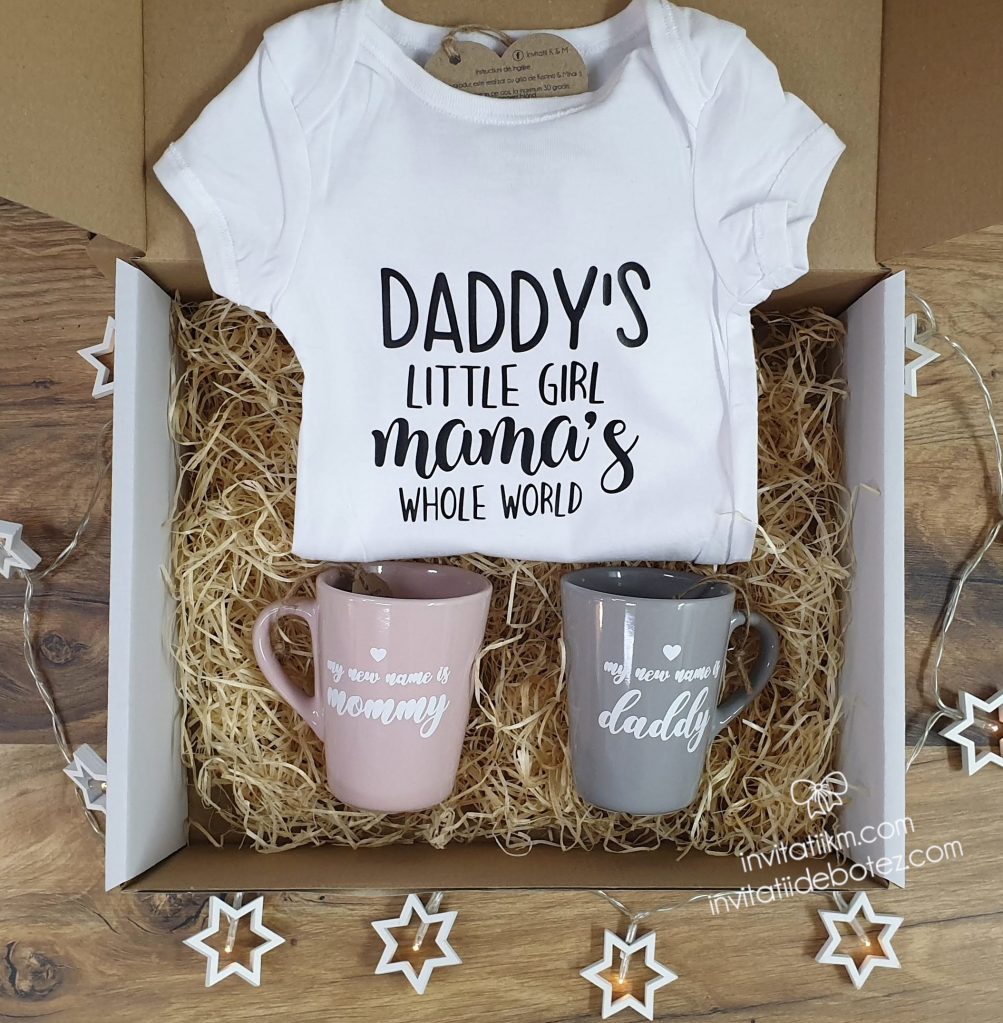 Set cadou pentru nou-nascut si tineri parinti, perfect pentru a sarbatori venirea pe lume a noului membru al familiei. Il veti primi ambalat in cutie + fundita asortata, gata de a-l oferi cadou si il putem expedia oriunde doriti, trebuie doar sa ne lasati adresa celui care il va primi. Textele se pot personaliza dupa preferinte.