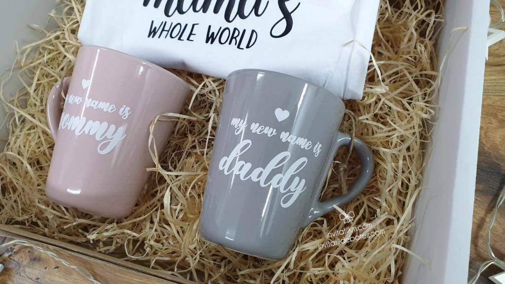 - doua cani din ceramica de 200-300 ml, in functie de culoare/stoc, personalizate cu vinil