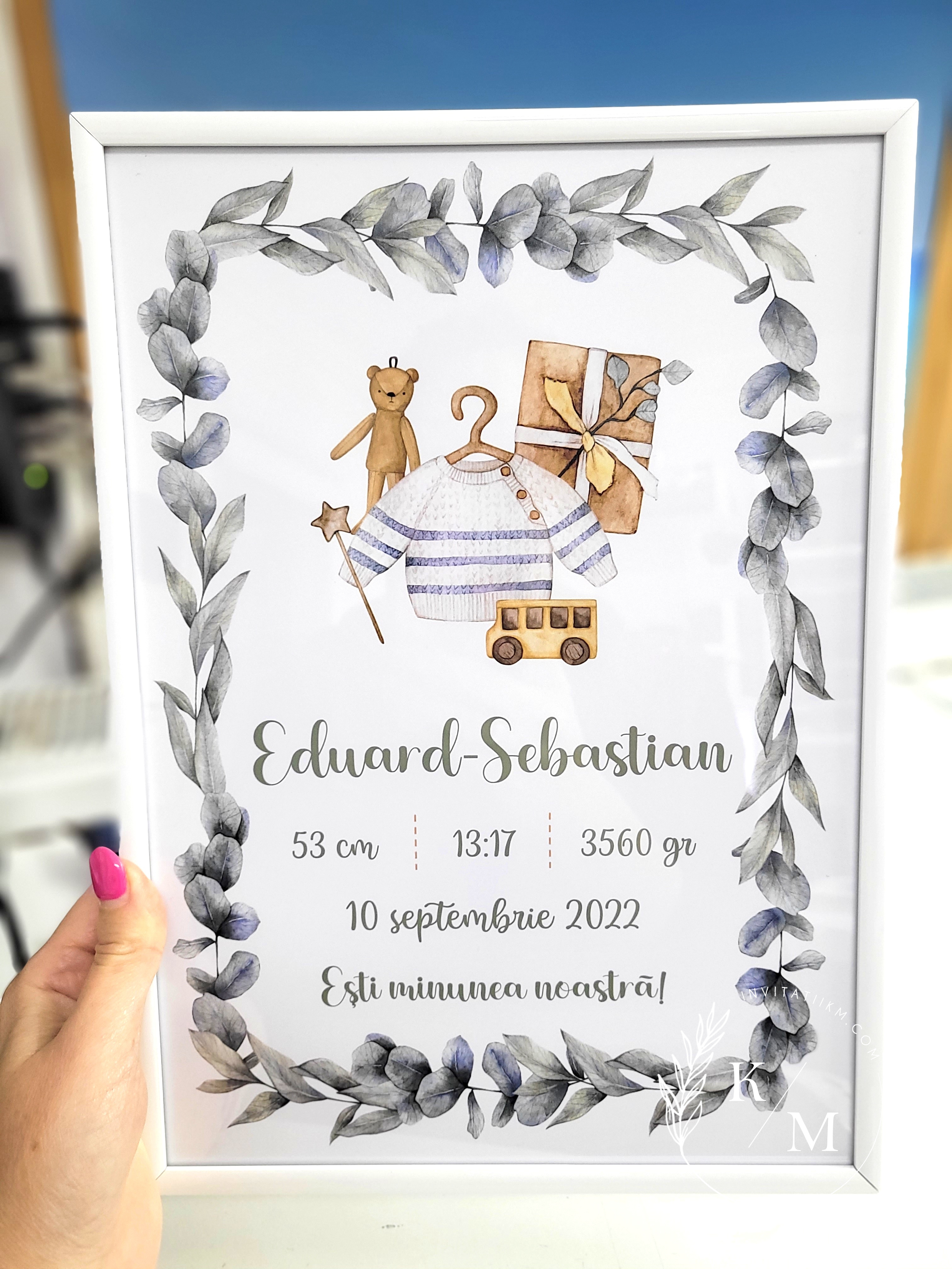 Tablou personalizat cu datele importante din prima zi de viata a bebelusului (nume, data nasterii, greutate etc), care sa va aminteasca mereu de frumoasa zi in care a venit pe lume minunea voastra.