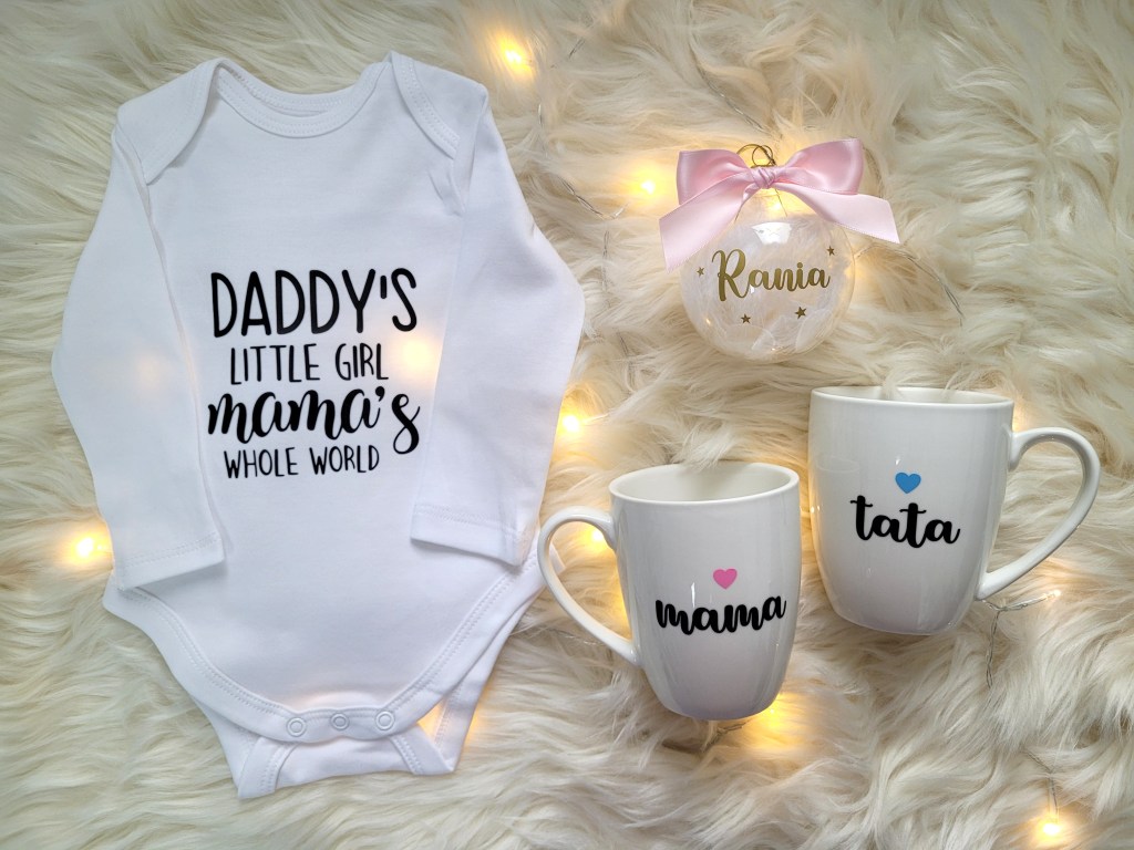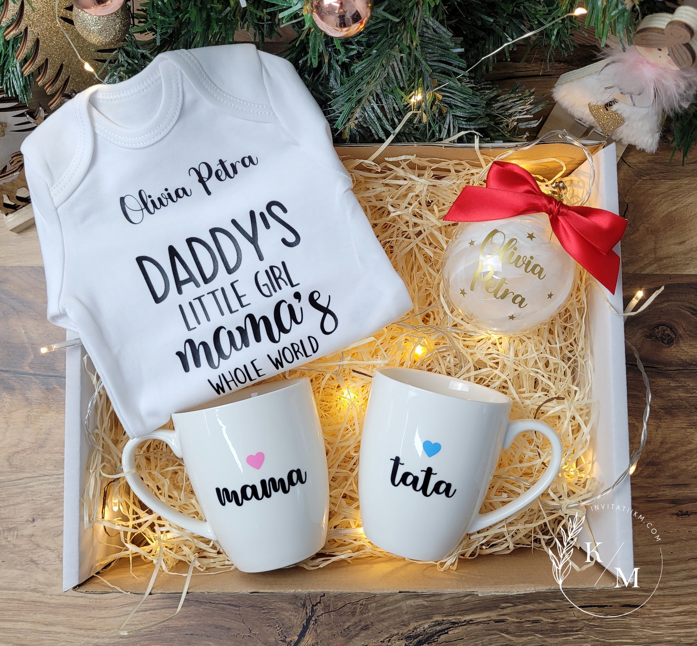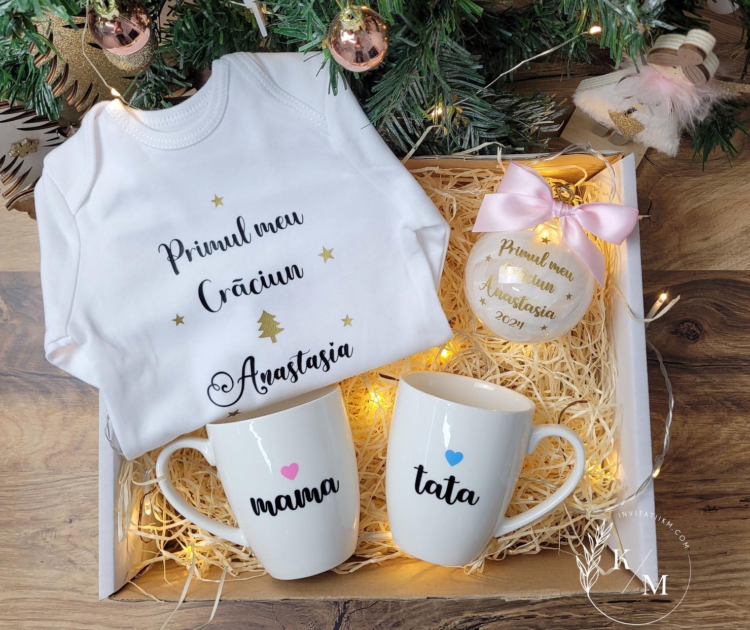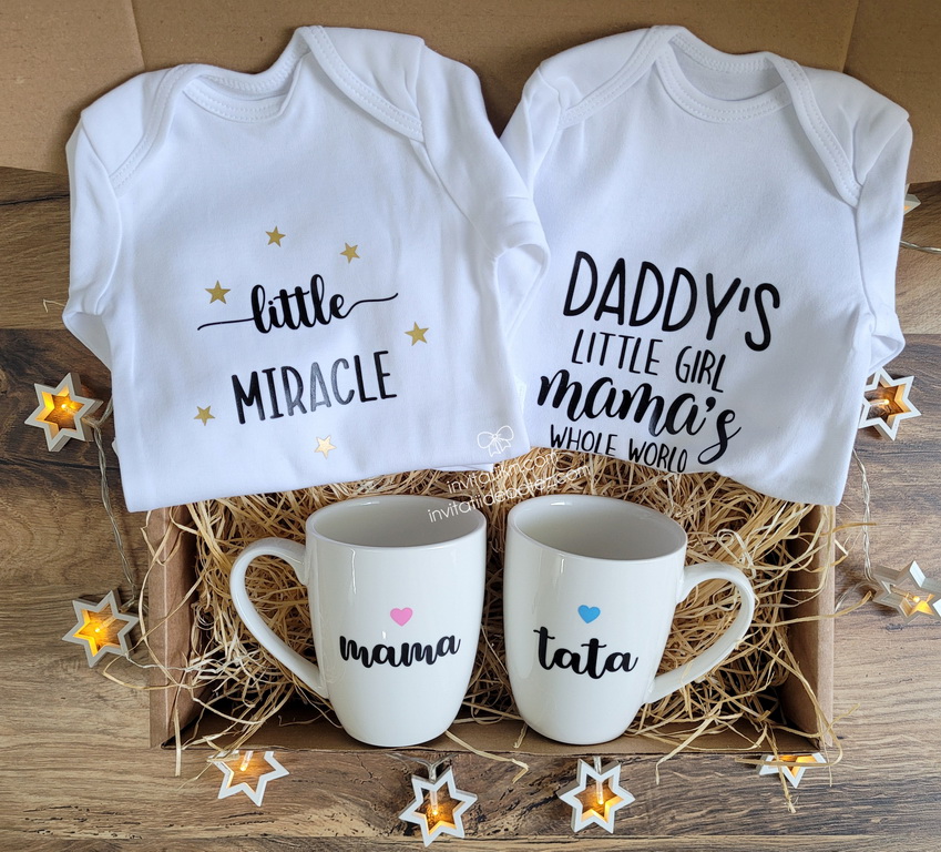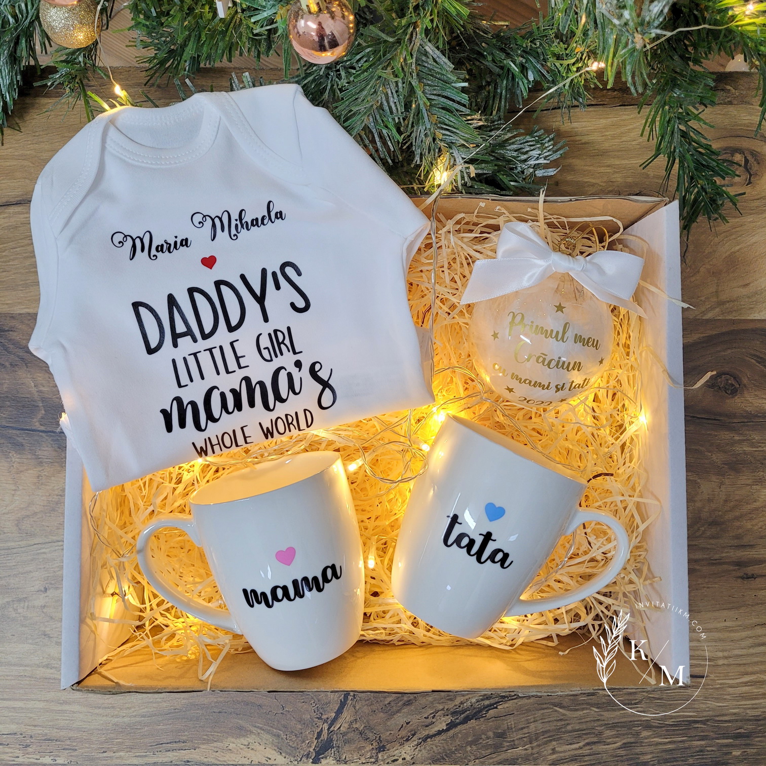 Set cadou pentru nou-nascut si tineri parinti, perfect pentru a sarbatori venirea pe lume a noului membru al familiei. Il veti primi ambalat in cutie + fundita asortata, gata de a-l oferi cadou si il putem expedia oriunde doriti, trebuie doar sa ne lasati adresa celui care il va primi. Textele se pot personaliza dupa preferinte.
