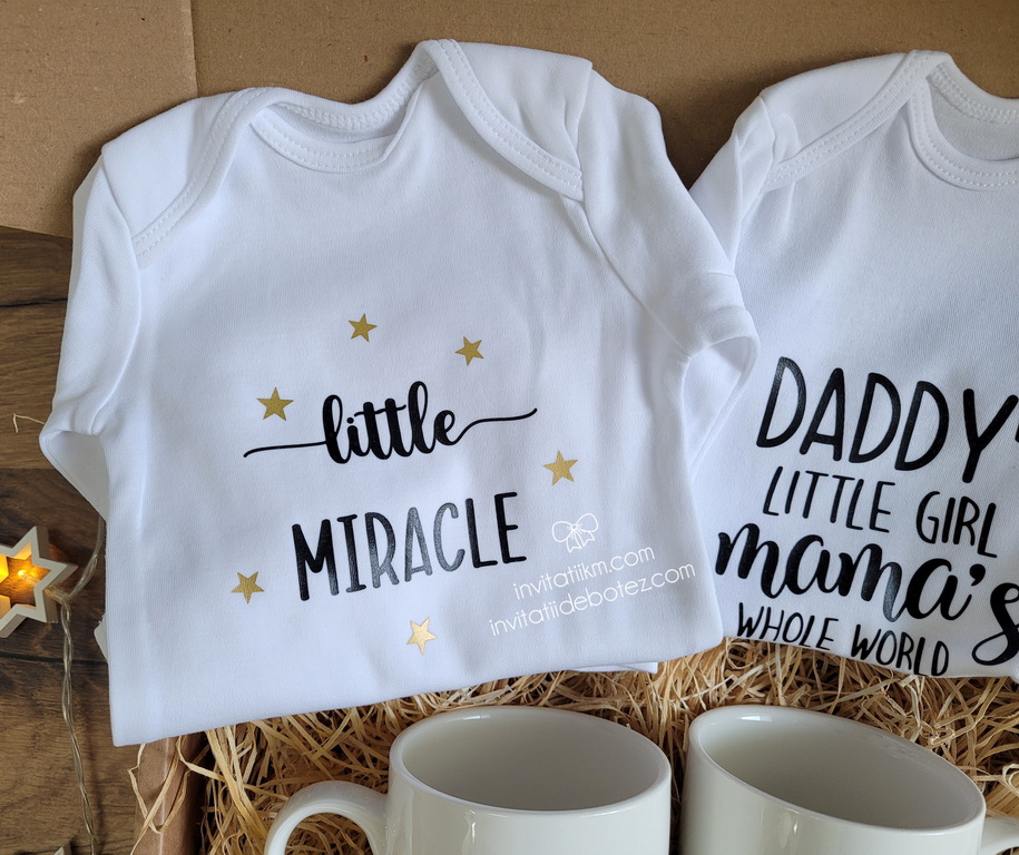 - un body din bumbac 100%, marimea necesara (de la 56 in sus) personalizat cu folie ce indeplineste standardul de toxicitate Oeko-Tex Standard 100, clasa I, perfecta pentru imprimarea hainutelor bebelusilor