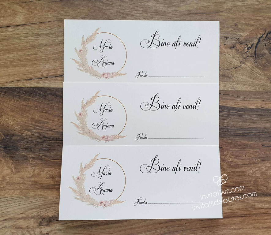 Plicuri de bani/carduri de asezare handmade cu coronita boho aurie, iarba de pampas si flori delicate roz prafuit