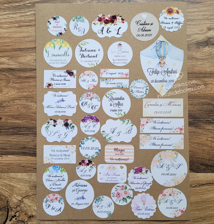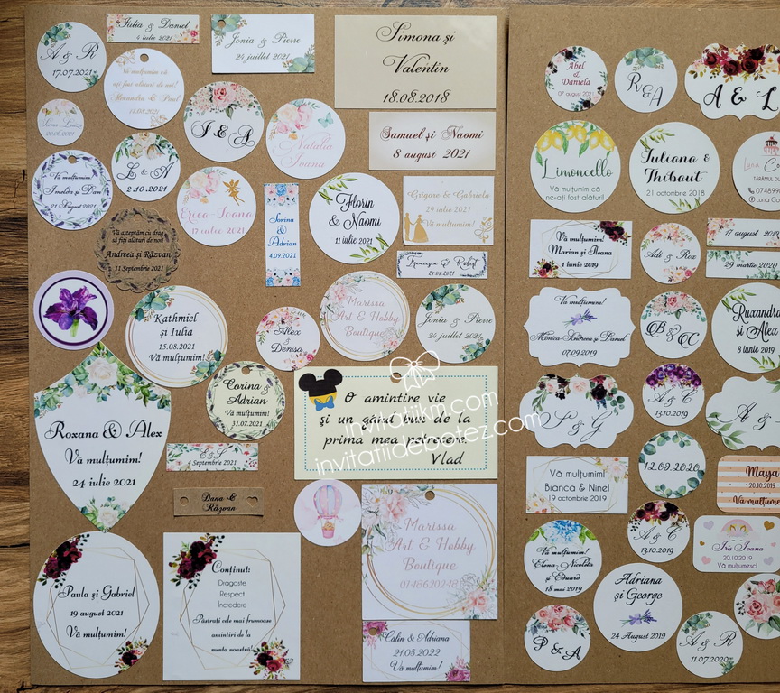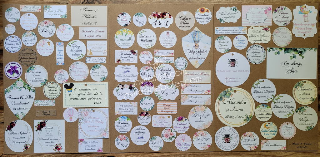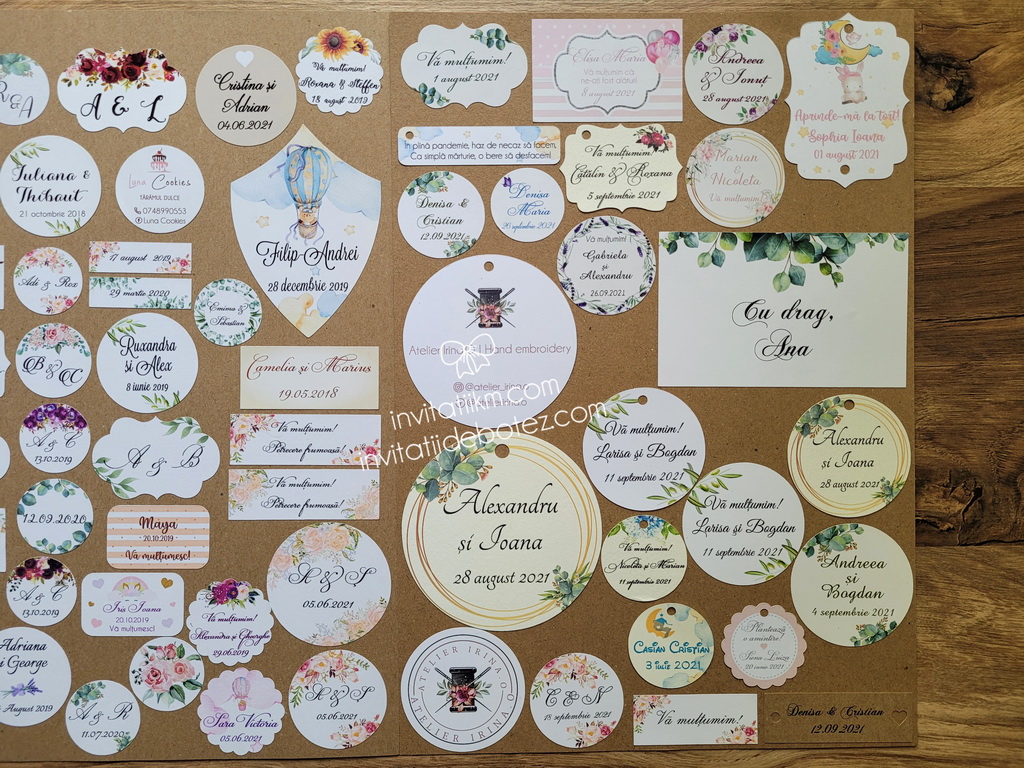Etichete pentru marturii realizate din carton alb, ivory sau reciclat si stickere/etichete adezive pentru marturii sau pentru invitatii realizate din autocolant mat sau lucios. Avem o gama foarte variata de forme, dimensiuni si grafica, ne puteti contacta pentru modele personalizate. Etichetele nu sunt decupate manual, astfel incat toate au aceeasi forma, dimensiune si calitate.