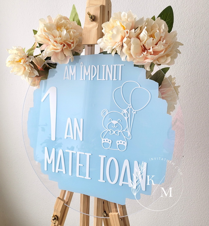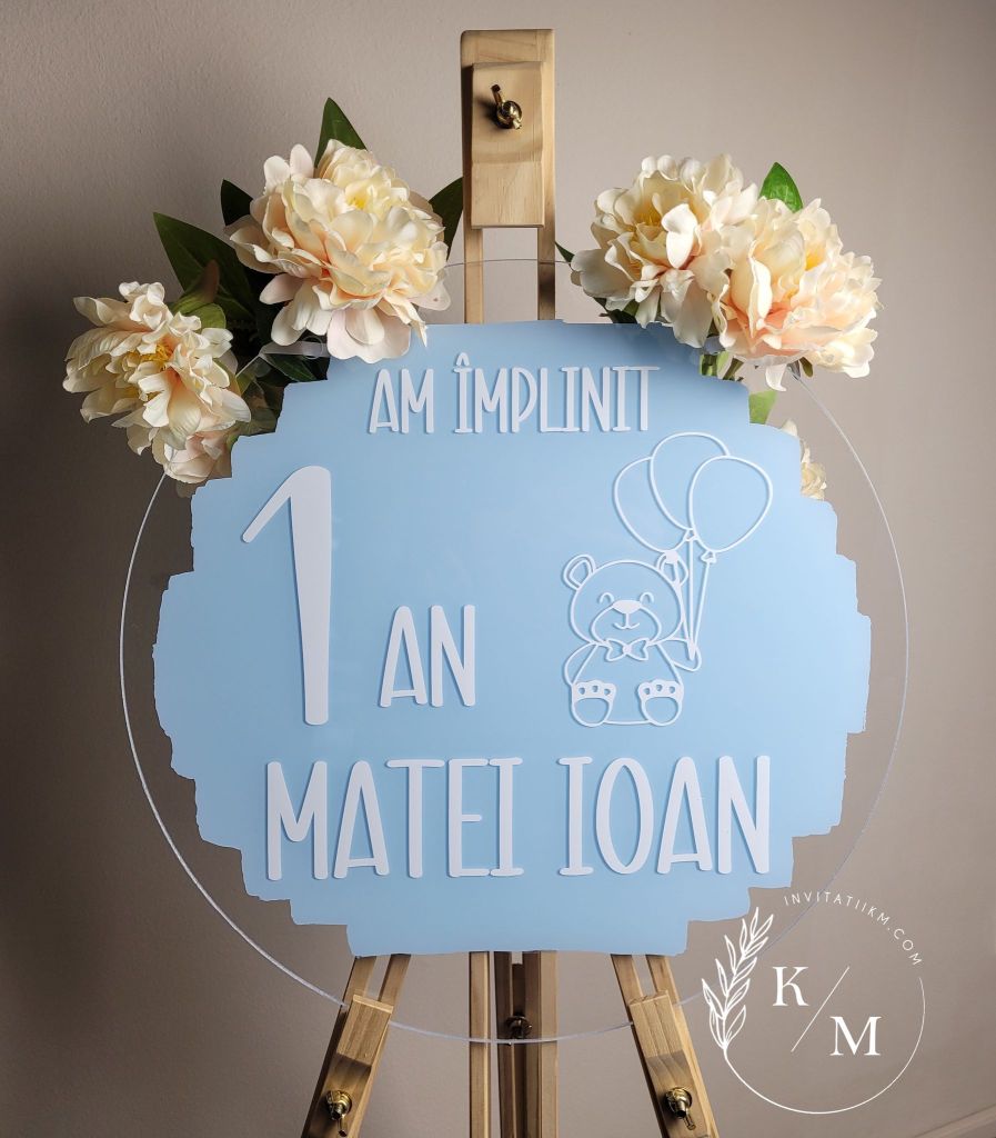 Panou de intampinare a invitatilor la botez/cifra aniversara pentru petrecerea de 1 an sau taierea motului, realizat din plexiglas transparent, personalizat cu text din autocolant alb/auriu si vopsit in diverse culori. Se pot realiza la fel si numere de masa, carduri de asezare. Se poate aseza pe sevalet sau se poate agata pe perete – nu uitati sa mentionati varianta dorita atunci cand plasati comanda: cu sau fara gaurele.