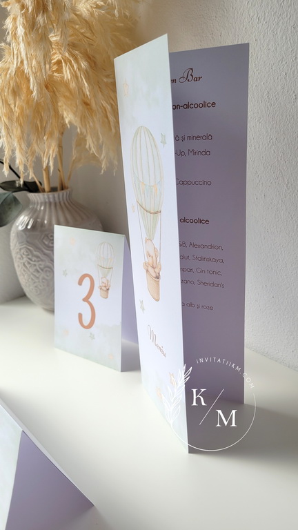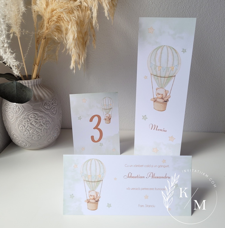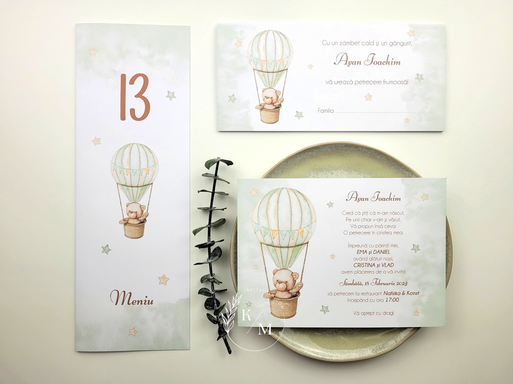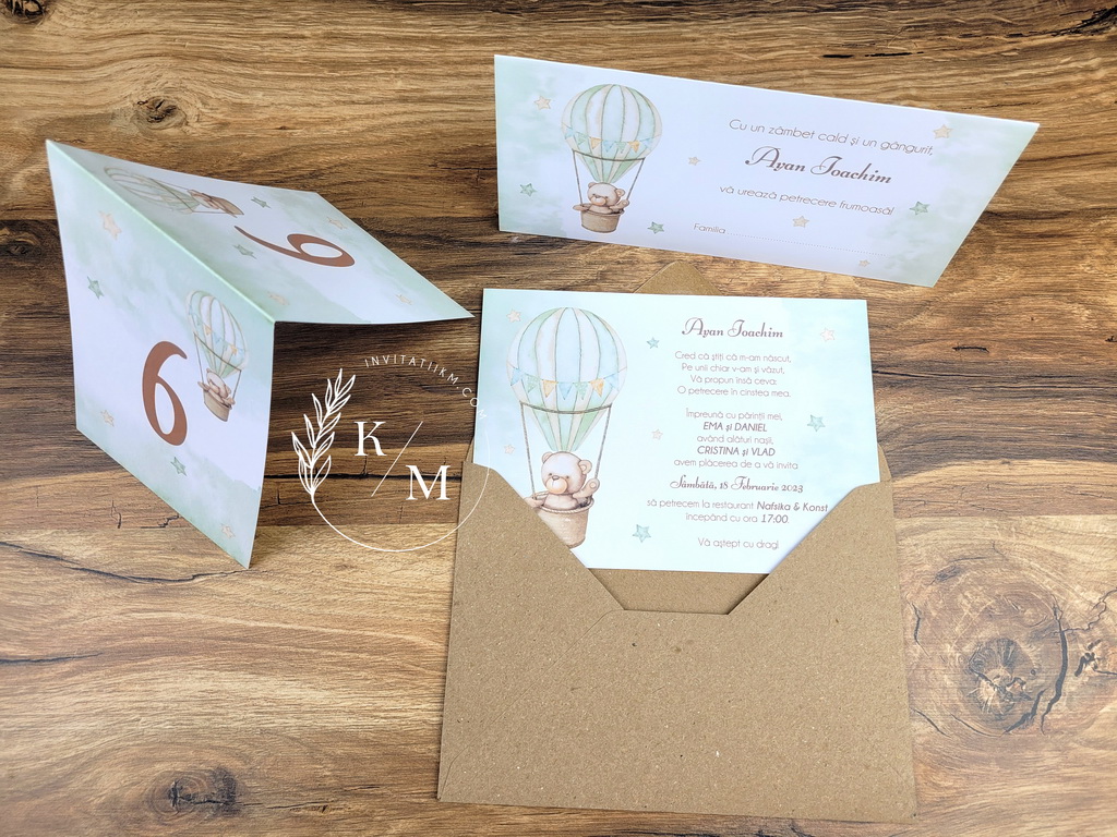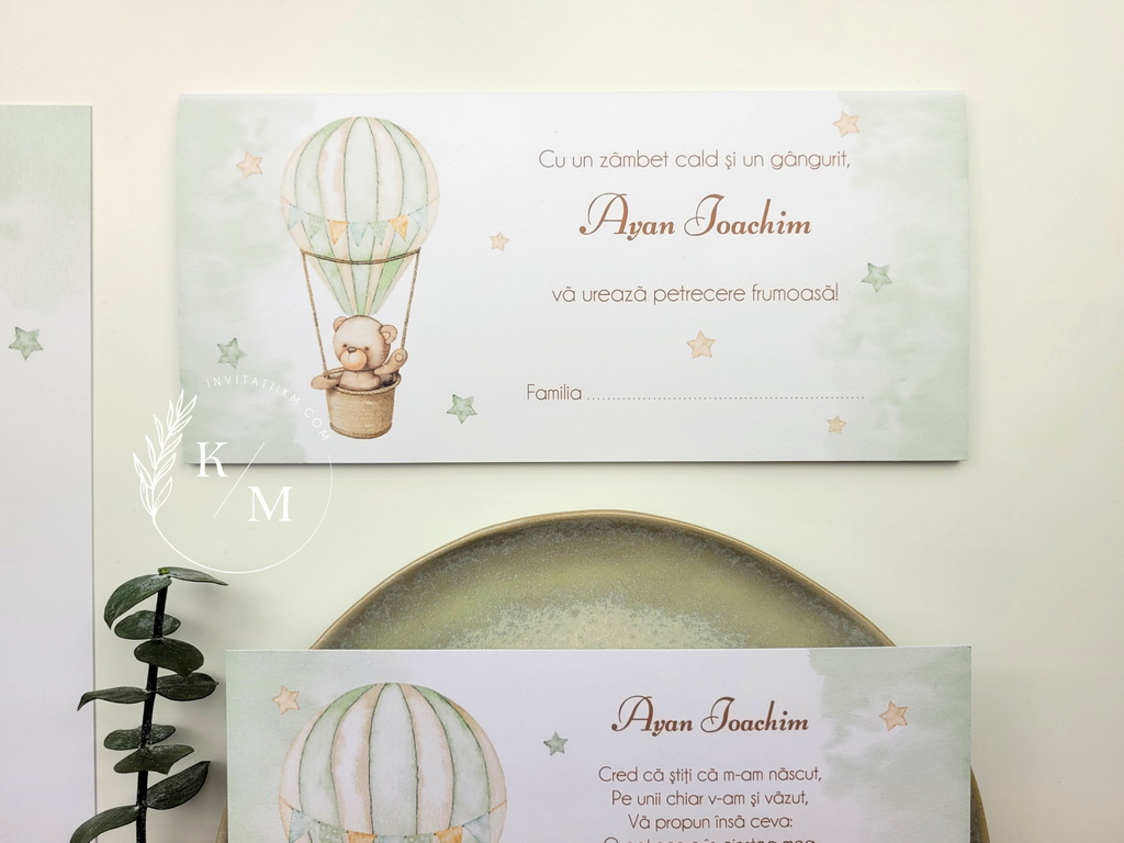Invitatii si papetarie de botez realizate din carton alb neted + plic asortat, cu ursulet in balon cu aer cald si stelute