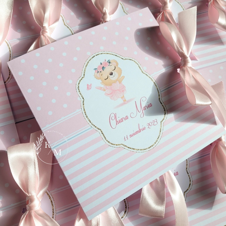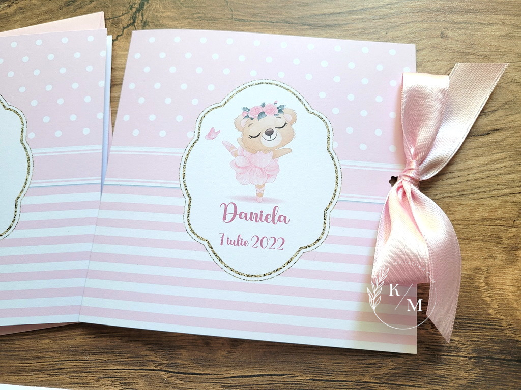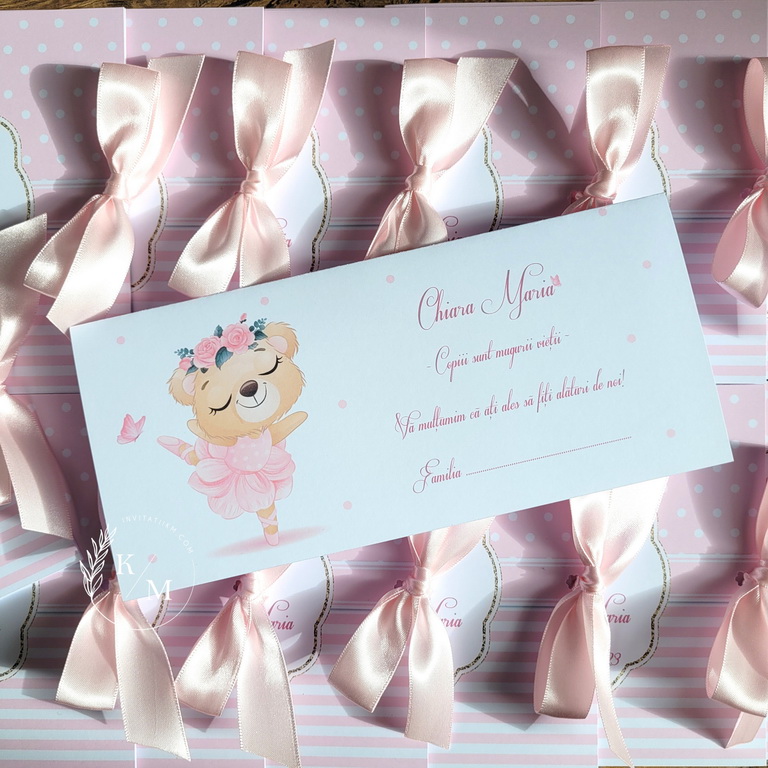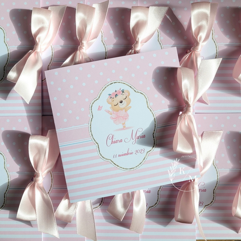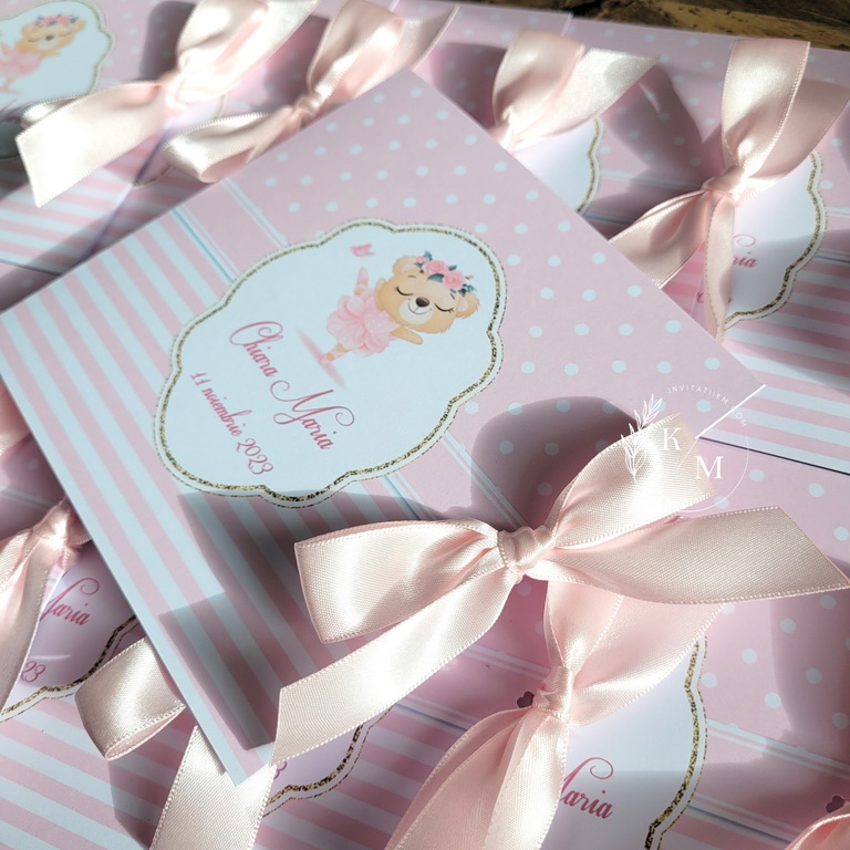 Invitatii si papetarie de botez realizate din carton alb neted + plic asortat, cu ursulet in balon cu aer cald si stelute