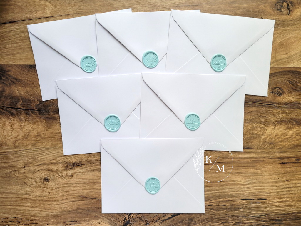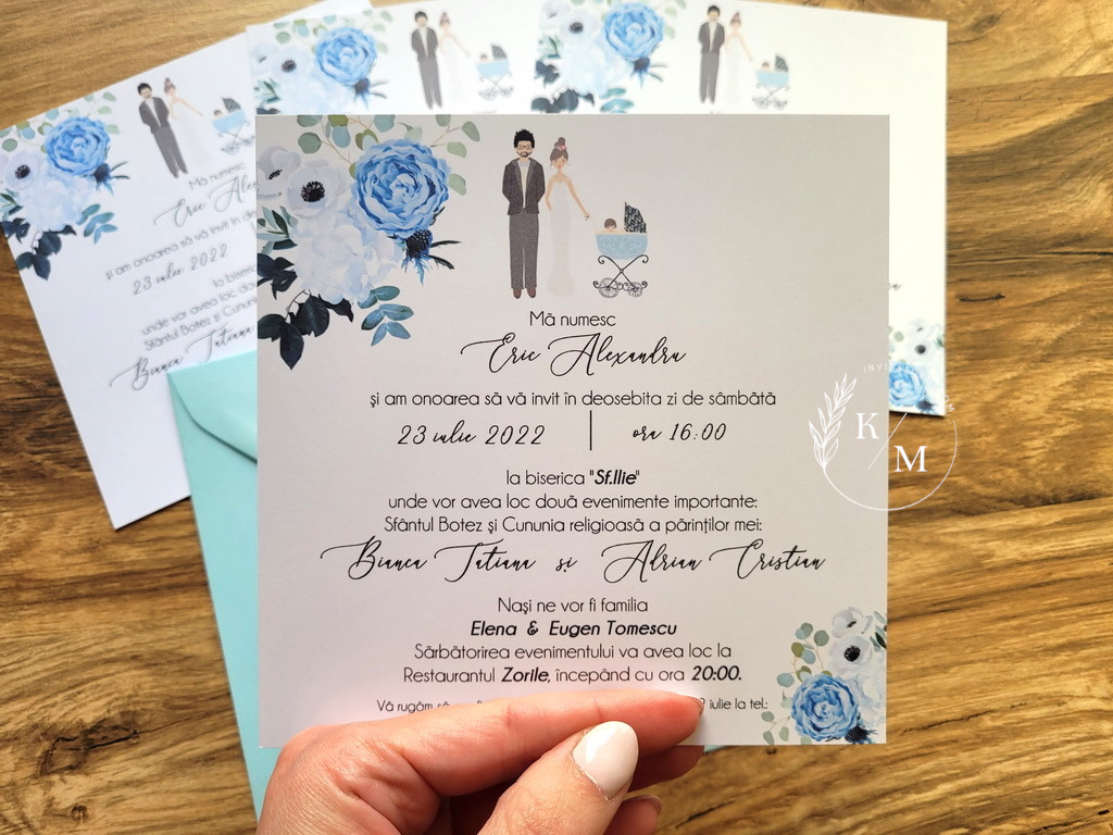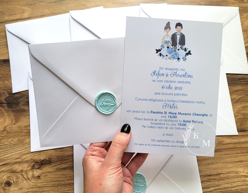 Invitatii de nunta si botez 2 in 1 realizate din carton alb neted cu miri si bebelus si plicuri asortate, inchise cu sigiliu din ceara bleu