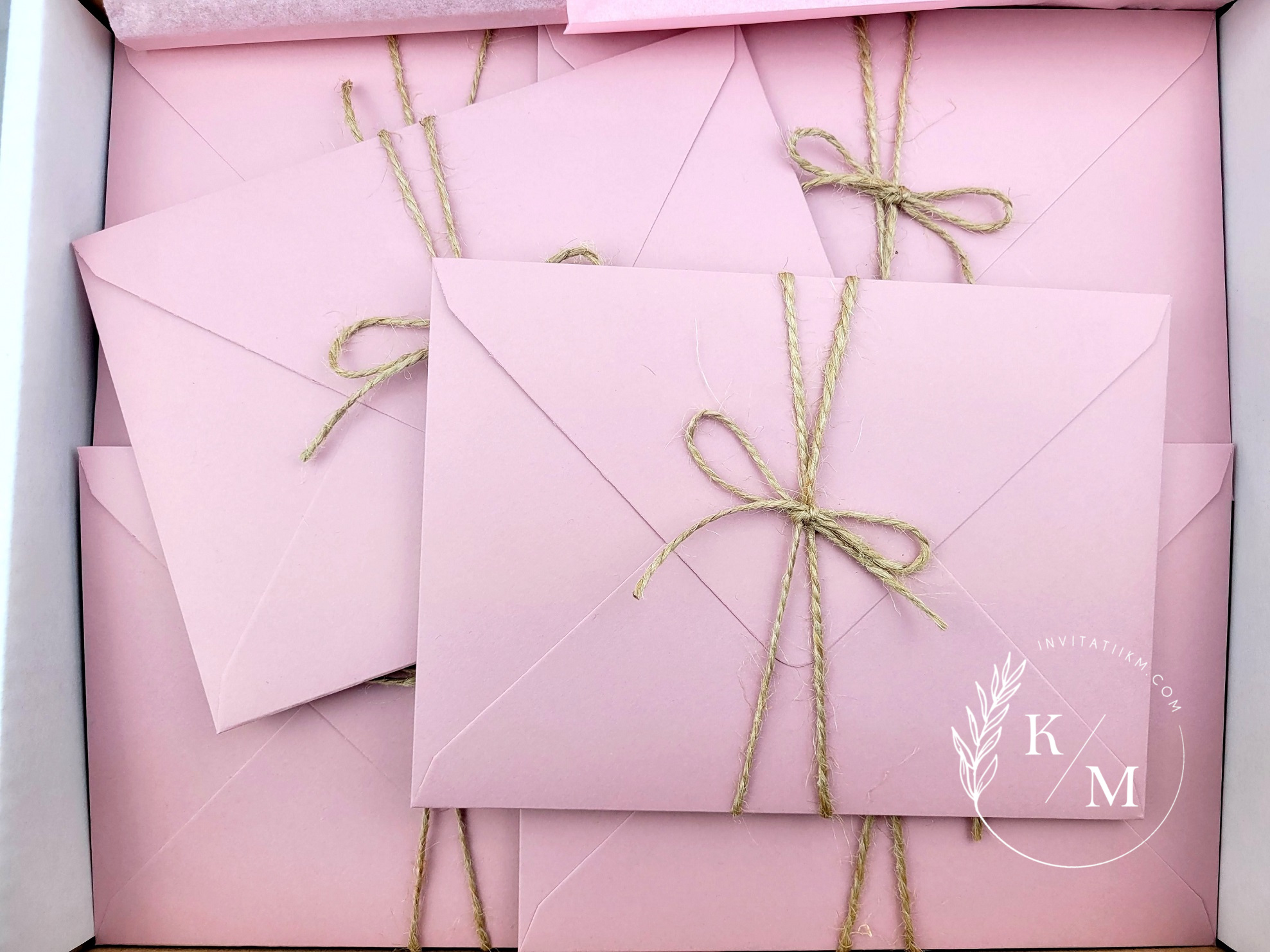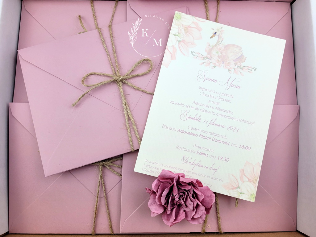 Invitatii de botez realizate din carton alb sau ivory, print cu lebada si flori asortate, si plic handmade roz antic/prafuit legat cu sfoara