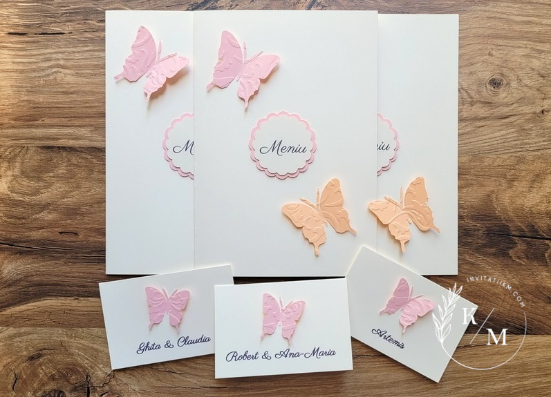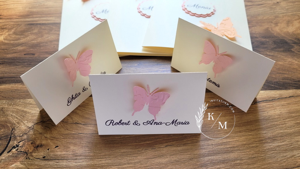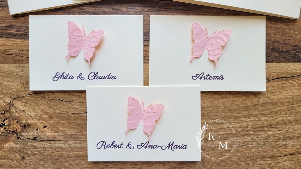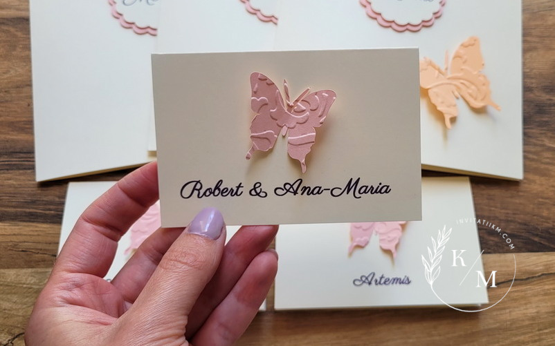 Carduri de asezare pentru botez cu numele invitatului realizate din carton ivory texturat si si fluturasi roz si somon decupati si embosati