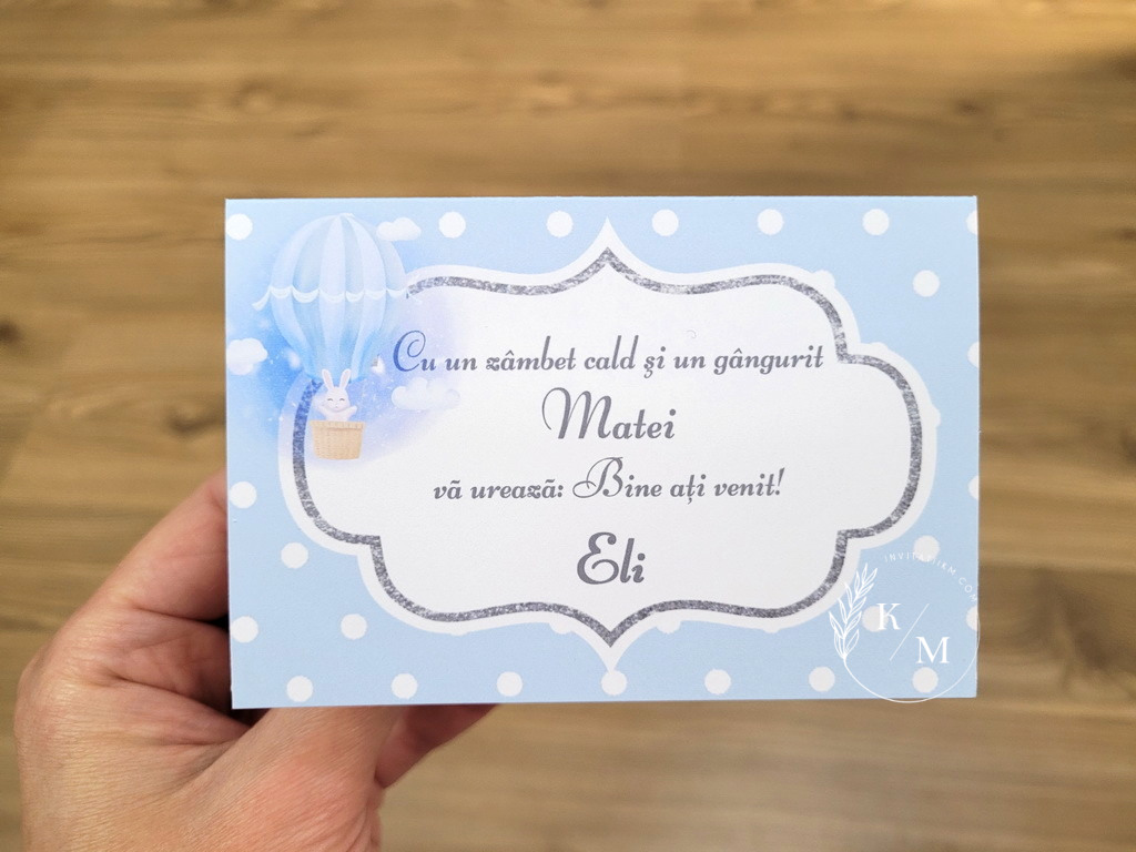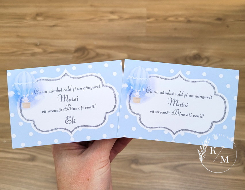 Carduri de asezare pentru botez cu numele invitatului realizate din carton alb neted si print iepuras simpatic in balon cu aer cald