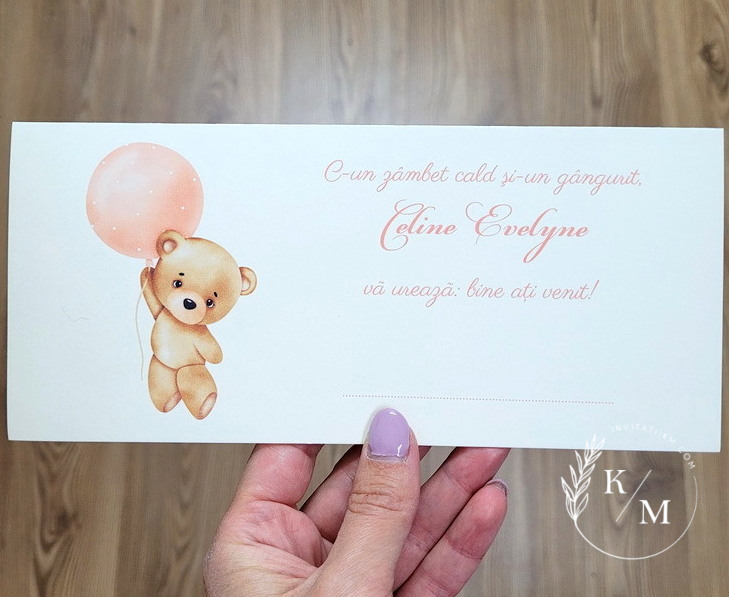 Papetarie/meniuri, plicuri de bani cu ursulet si baloane roz-corai pentru fetite