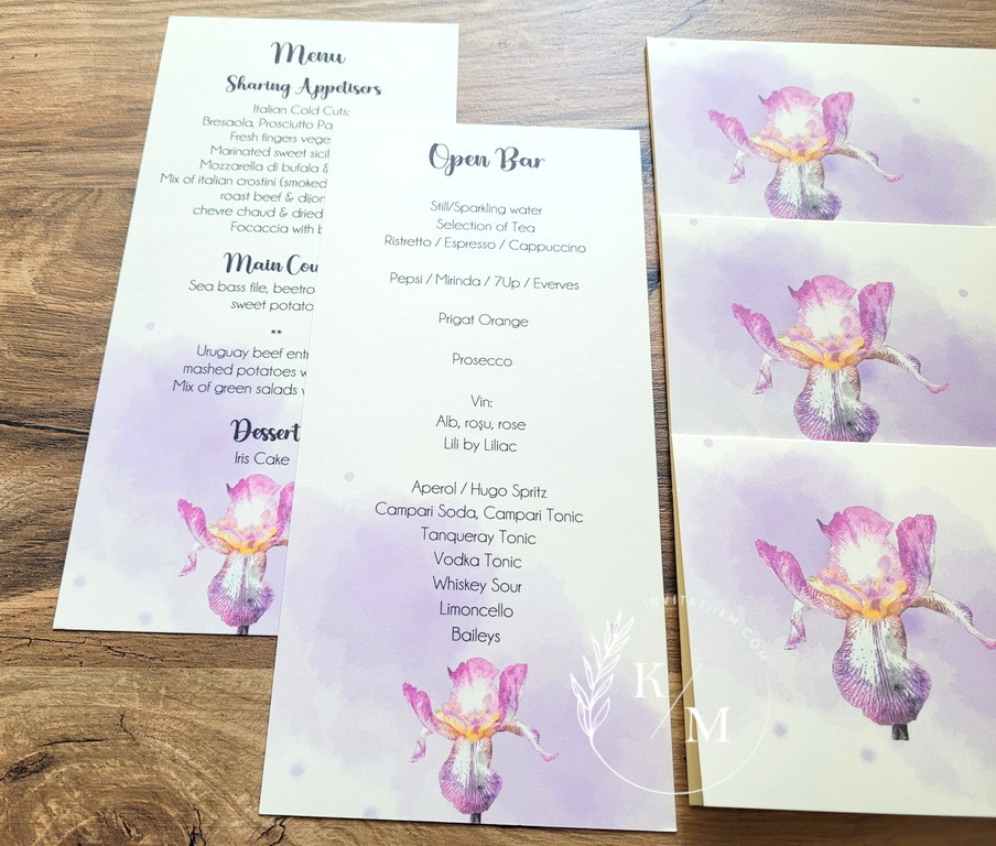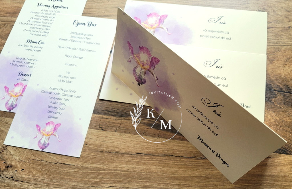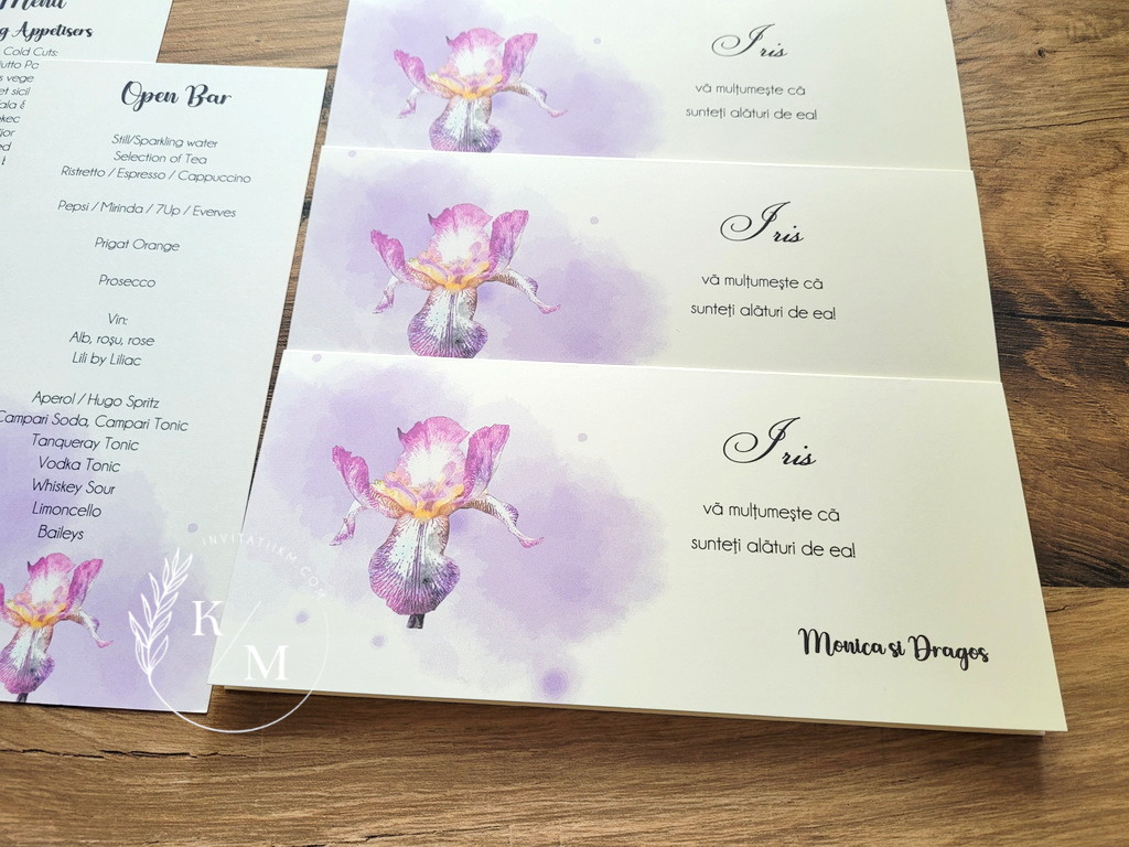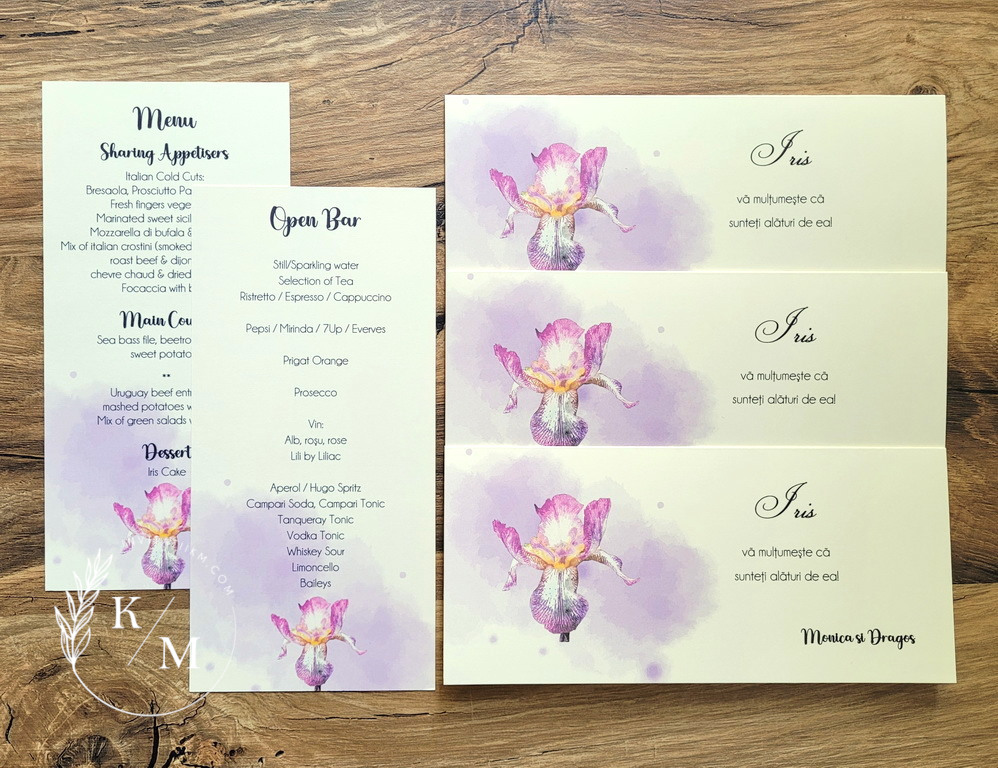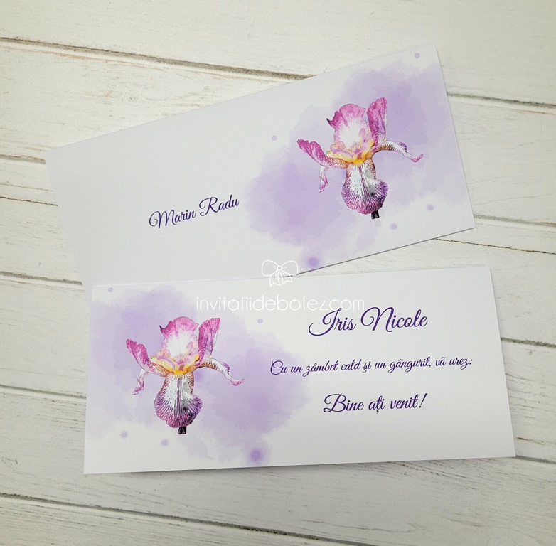 Papetarie de botez realizata din carton alb neted/ivory texturat, print cu iris mov-roz si acuarela in nuante de mov