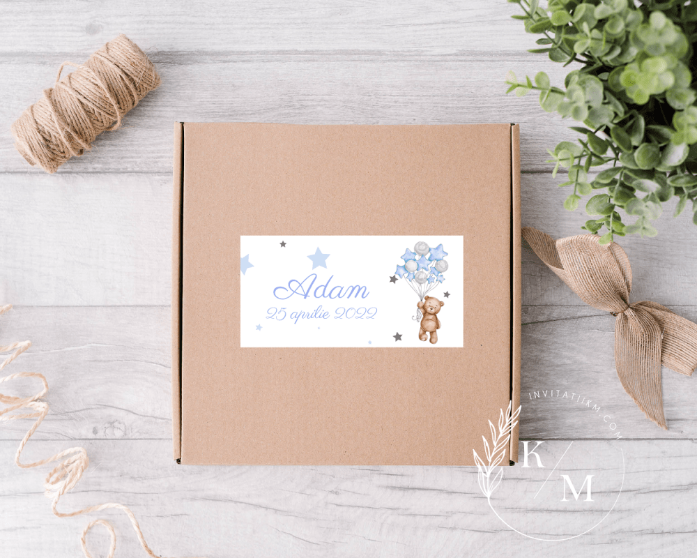 Stickere, etichete autoadezive cu ursulet simpatic si baloane bleu si albe, pentru marturii de botez. Pot fi realizate din autocolant mat/lucios pentru a fi lipite sau pot fi din carton cu gaurica pentru a fi legate (se livreaza fara snur/sfoara).