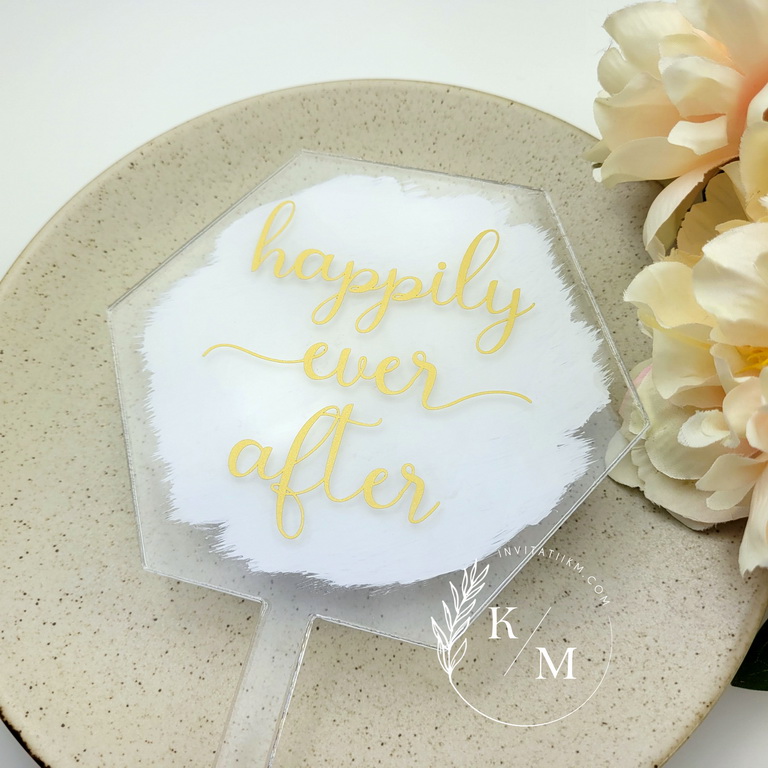 Topper pentru tort realizat din plexiglas transparent, personalizat cu text din autocolant auriu si vopsit in diverse culori. Se pot realiza la fel si numere de masa, carduri de asezare, semne de carte.