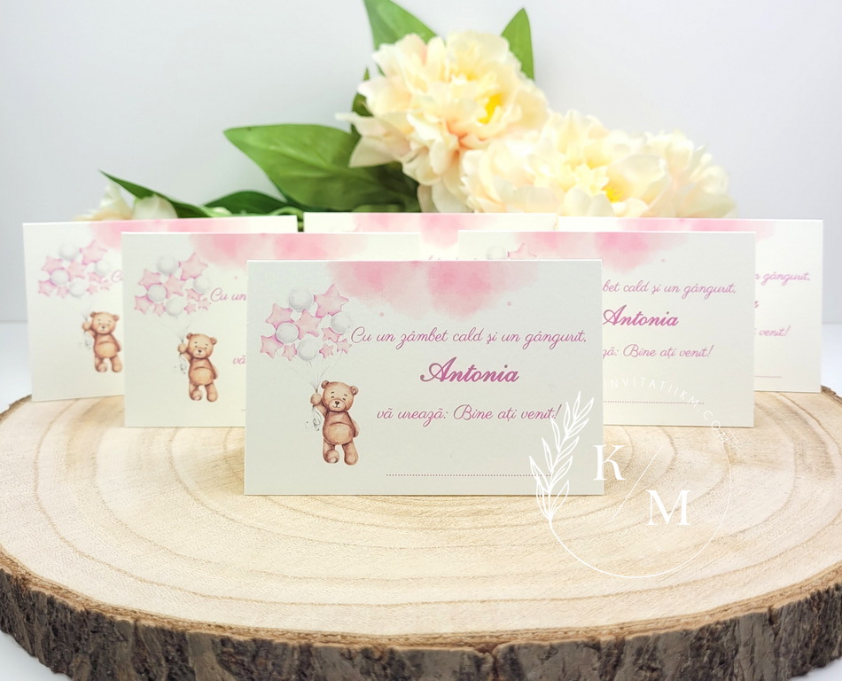 Carduri de asezare pentru botez cu numele invitatului realizate din carton alb neted/ivory texturat si print cu ursulet si baloane colorate