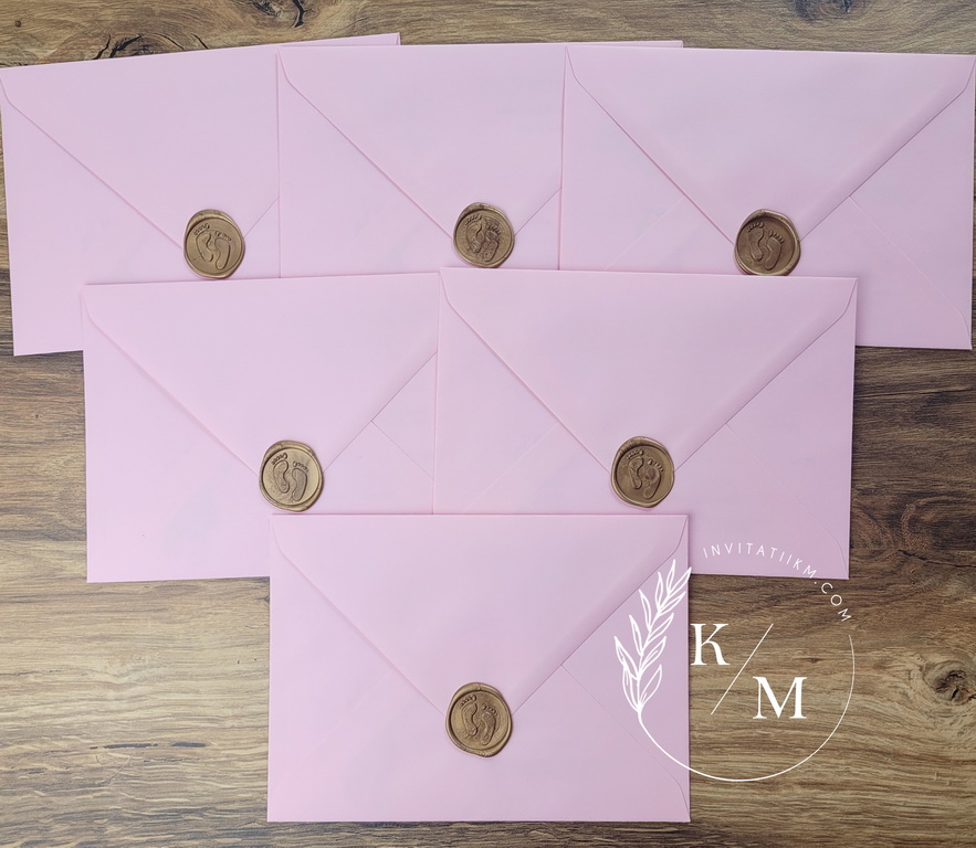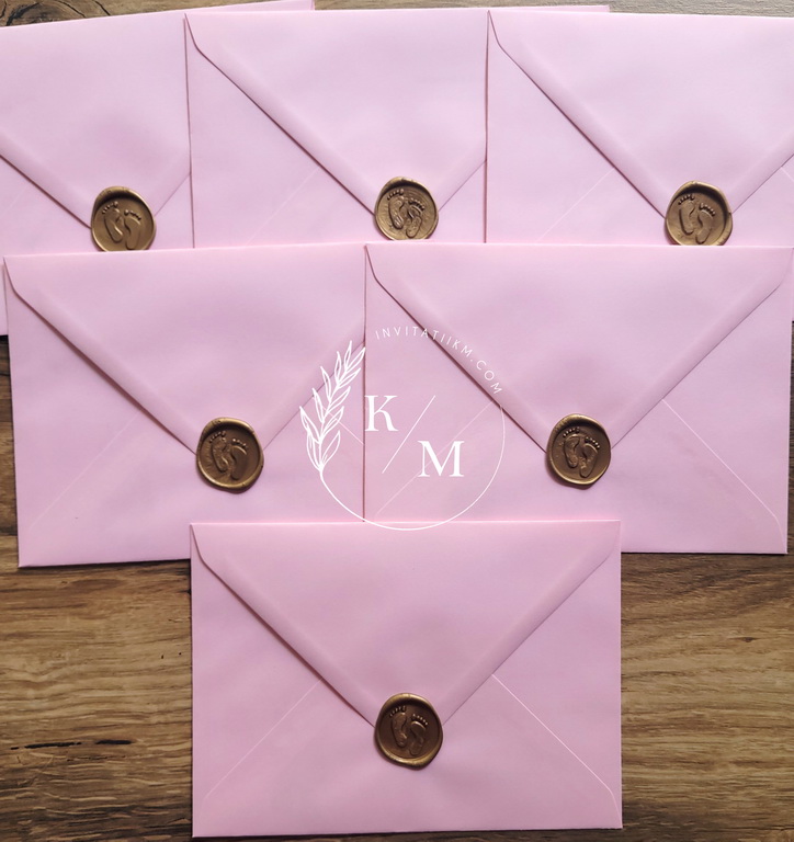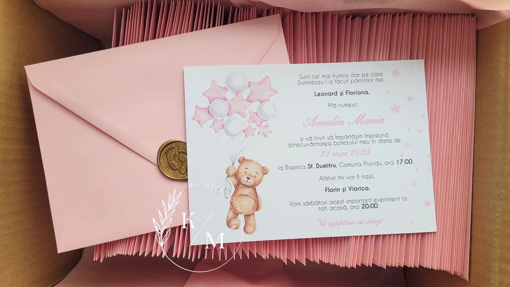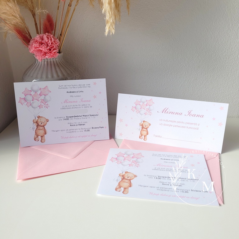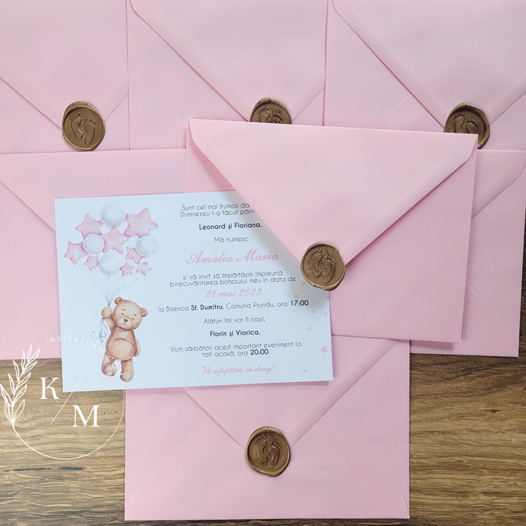 Invitatii de botez pentru fetita realizate din carton ivory texturat, print cu ursulet simpatic si baloane roz si albe, plicuri roz inchise cu sigiliu turnat la cald cu talpi de bebelus
