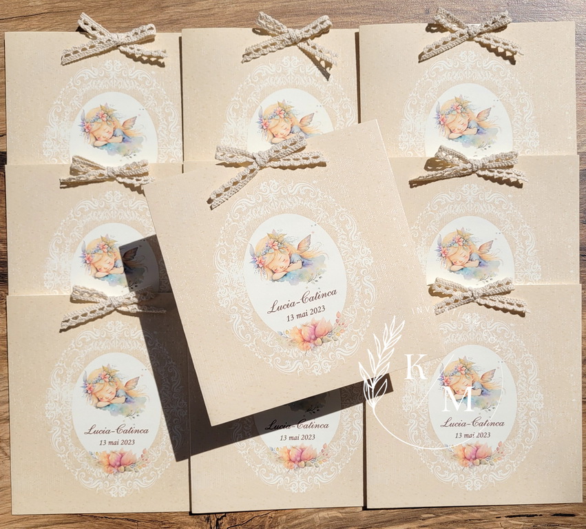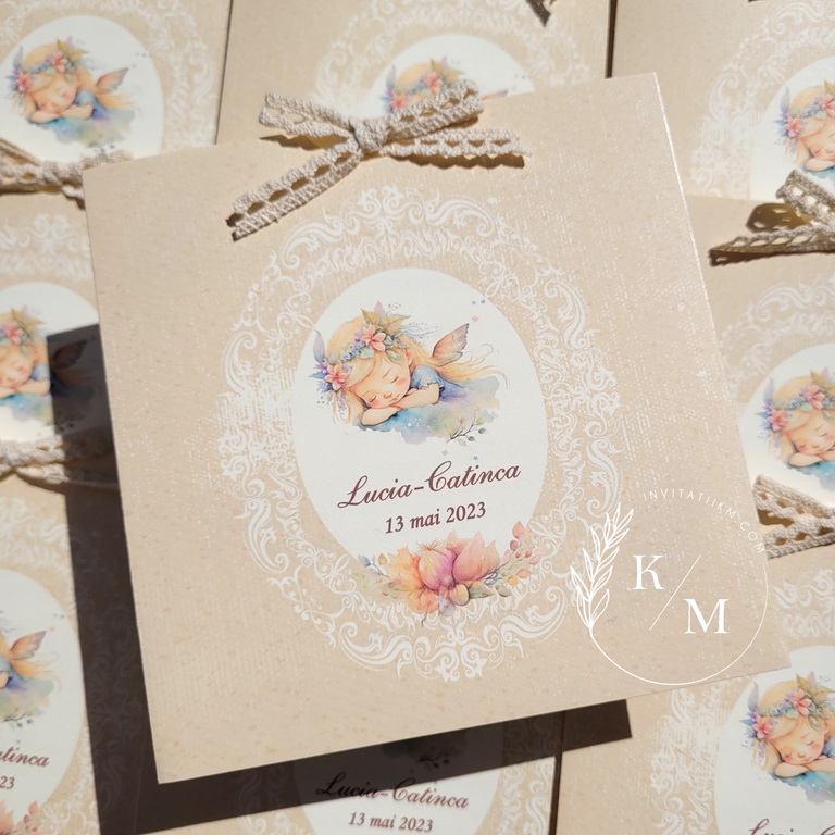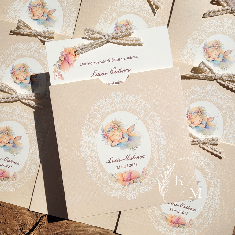 Invitatie de botez realizata din carton gros cu text si fundita din dantela din bumbac + plic realizat manual din carton subtire imprimat cu flori, chenar dantelat si zana. Nu are nevoie de plic.