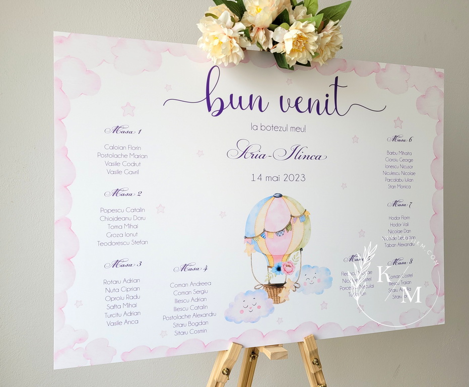 Lista de asezare a invitatilor la mese cu balon cu aer cald roz, norisori si stelute, pentru fetita. La plasarea comenzii, va rugam sa specificati daca doriti format digital sau printat.