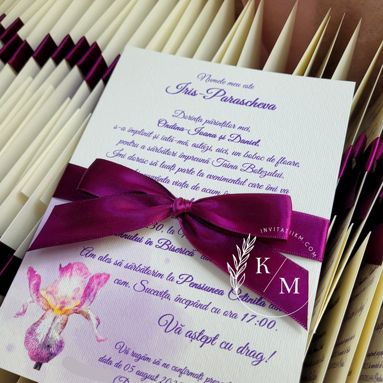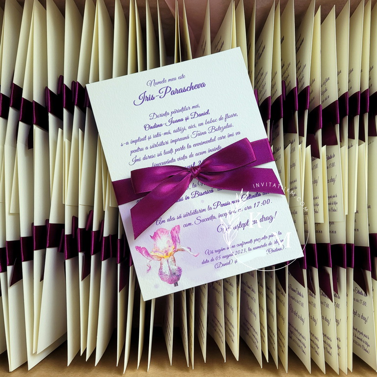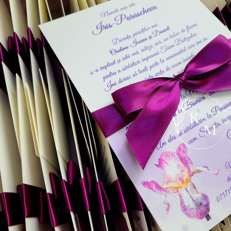 Invitatii de botez cu floare de iris in nuante de mov si roz, legate cu panglica din satin (funditele sunt de calitate, iar capetele nu se desira). Nu necesita plic.