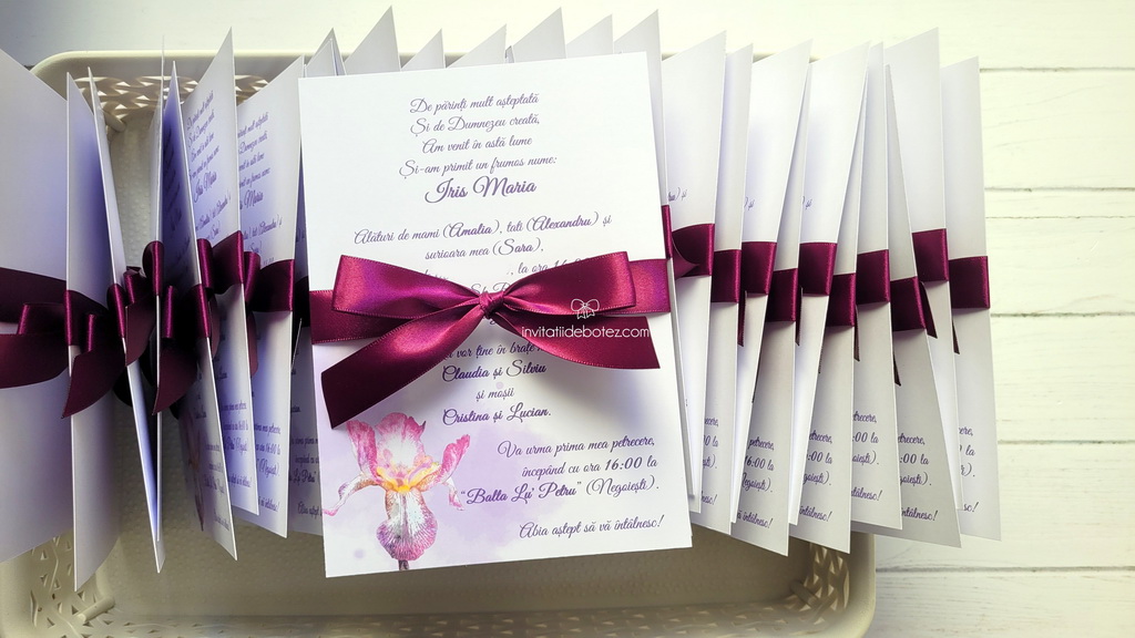 Invitatii de botez cu floare de iris in nuante de mov si roz, legate cu panglica din satin (funditele sunt de calitate, iar capetele nu se desira). Nu necesita plic.