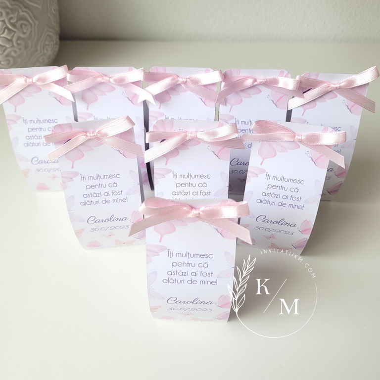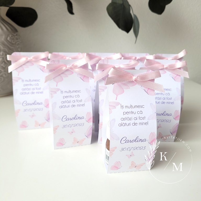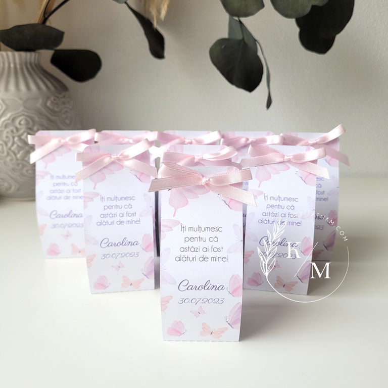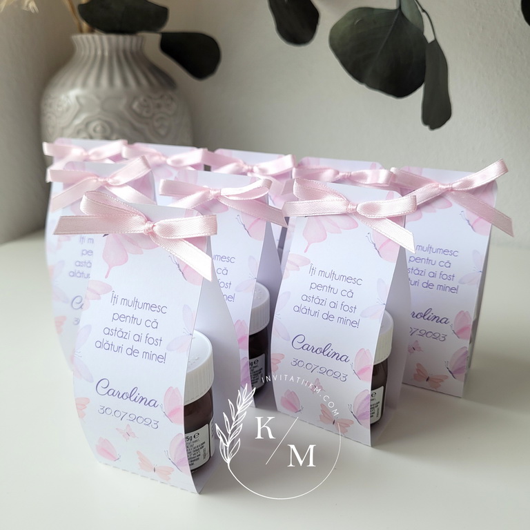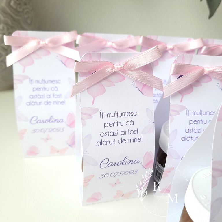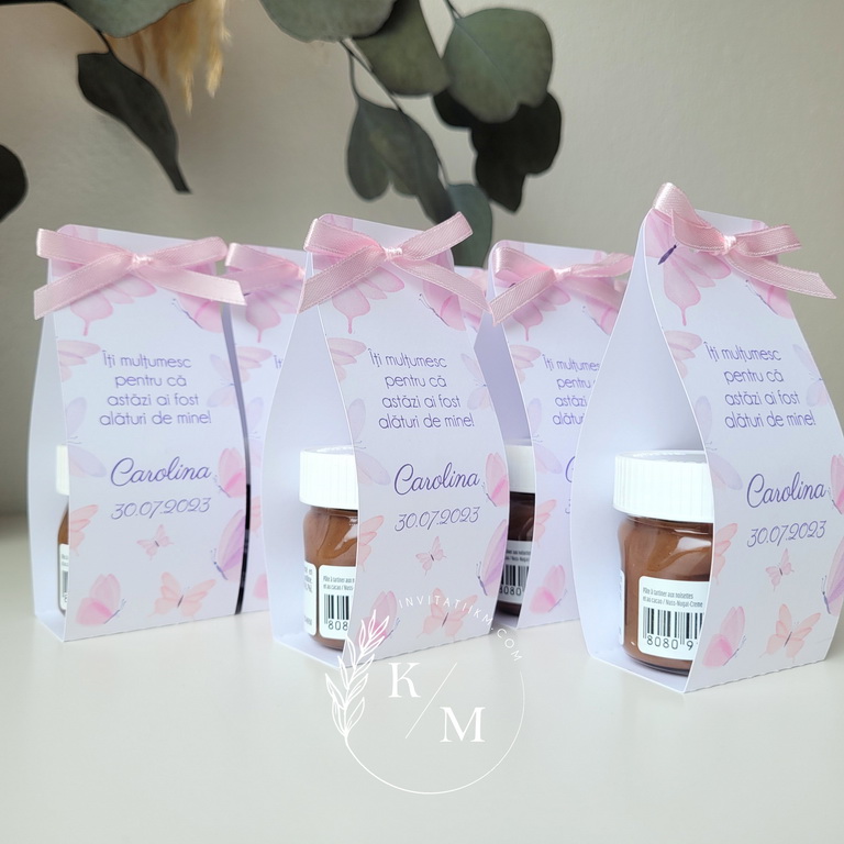Cartonase pentru marturii de botez/cutii pentru marturii de botez ce pot fi folosite pentru borcanase de Nutella, borcanase de miere/dulceata sau pentru lumanari bubble – dimensiunile se pot modifica in functie de necesitate. In partea de sus au una sau doua gaurele pentru a lega funditele iar la baza sunt biguite pentru a fi indoite.