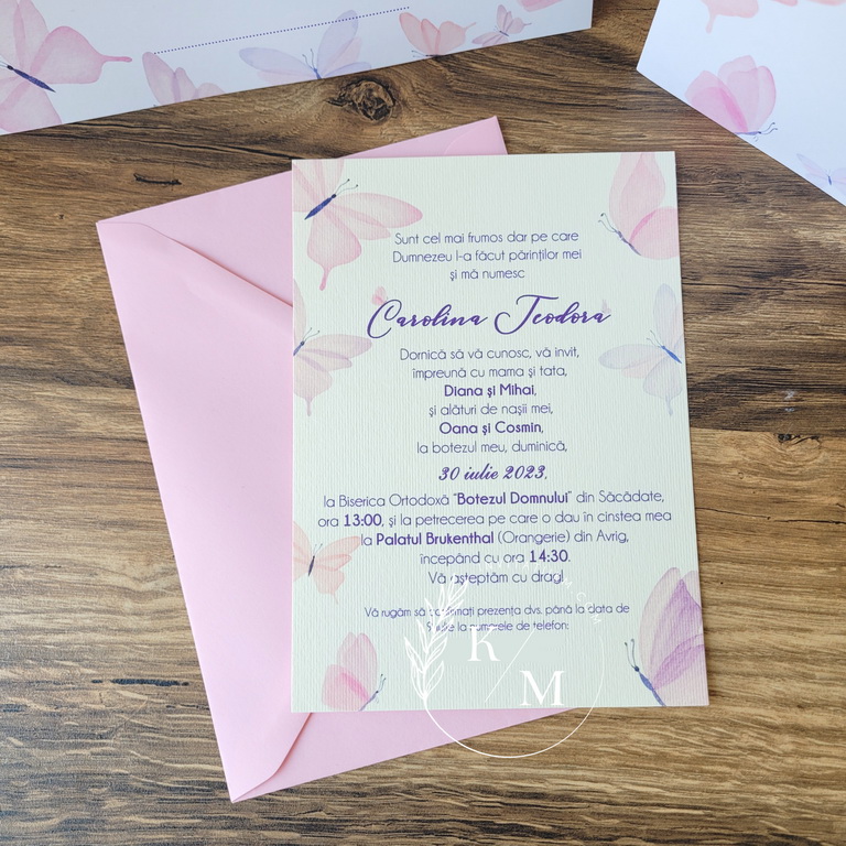 Invitatii de botez cu fluturasi roz, mov-lila si somon realizate din carton alb neted sau ivory texturat + plic asortat roz