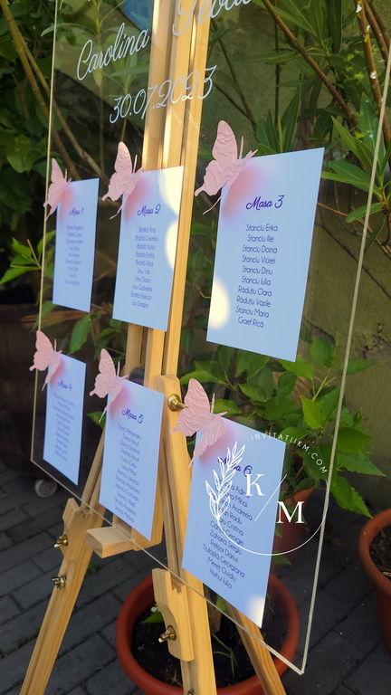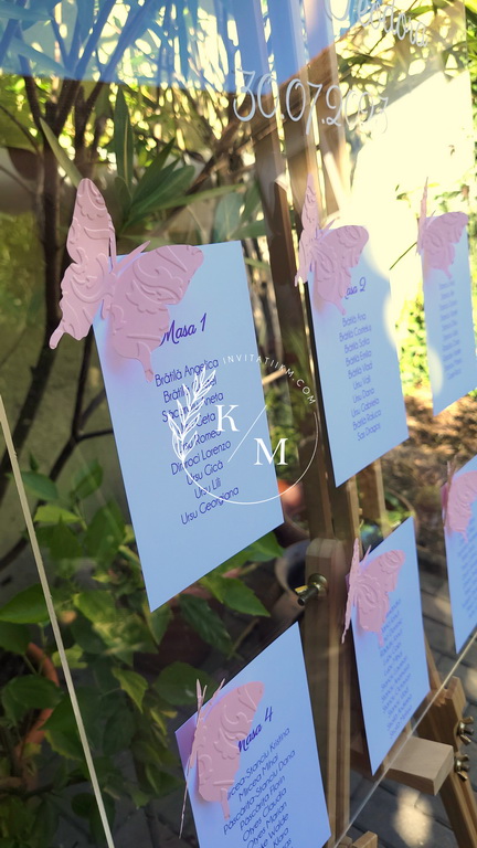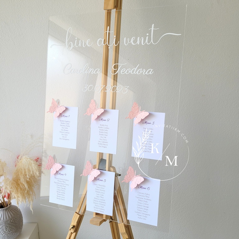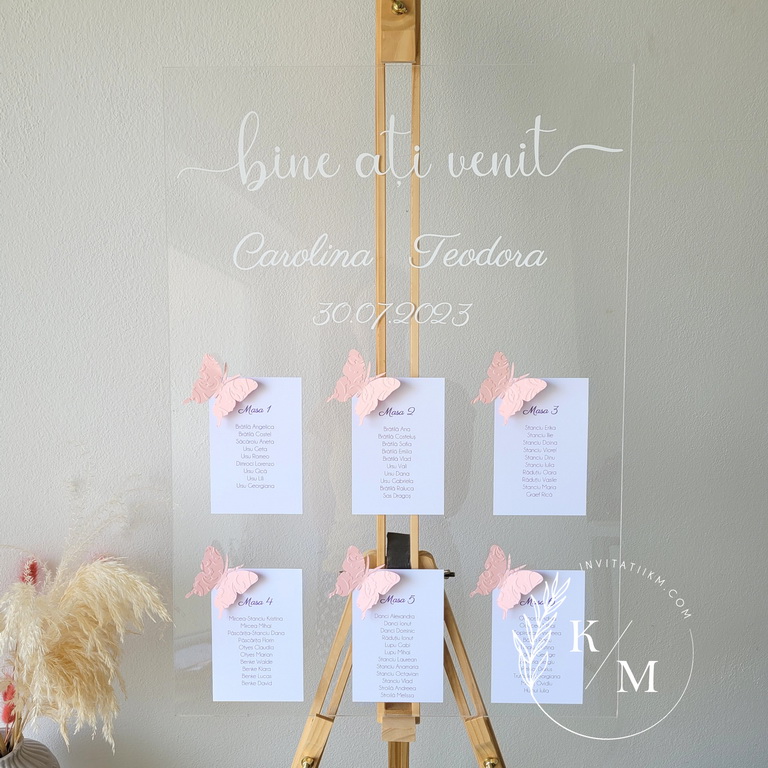 Panou de intampinare pentru nunta cu cartonase cu asezarea invitatilor la mese. Panoul este realizat din plexiglas transparent, are dimensiunea 50 x 70 cm, iar cartonasele sunt realizate din carton alb neted + fluturasi decupati si embosati. In functie de numarul cartonaselor, acestea pot fi mai mari/mai micute. Se pot achizitiona impreuna sau separat.