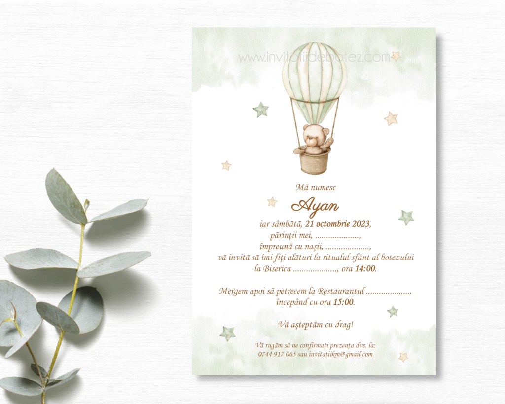 Invitatie online de botez cu ursulet in balon cu aer cald verde