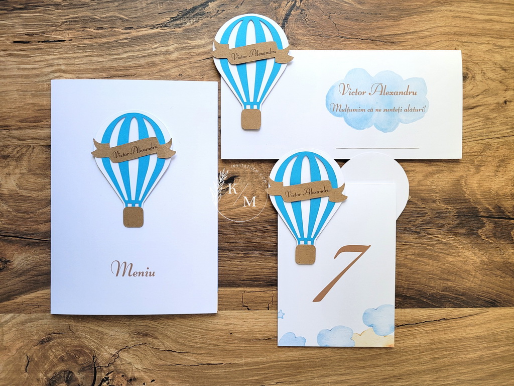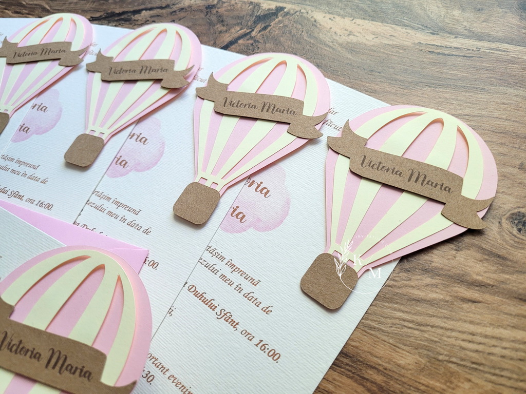 Invitatie de botez pentru fetite cu balon cu aer cald decupat roz si galben, cu detalii din carton reciclat.