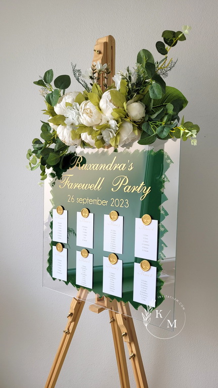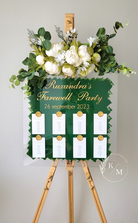 Panou de intampinare pentru botez cu cartonase cu asezarea invitatilor la mese. Panoul este realizat din plexiglas transparent vopsit in diverse culori pe verso, are dimensiunea 50 x 50 cm, iar cartonasele sunt realizate din carton alb neted + sigiliu. In functie de numarul cartonaselor, acestea pot fi mai mari/mai micute. Se pot achizitiona impreuna sau separat.