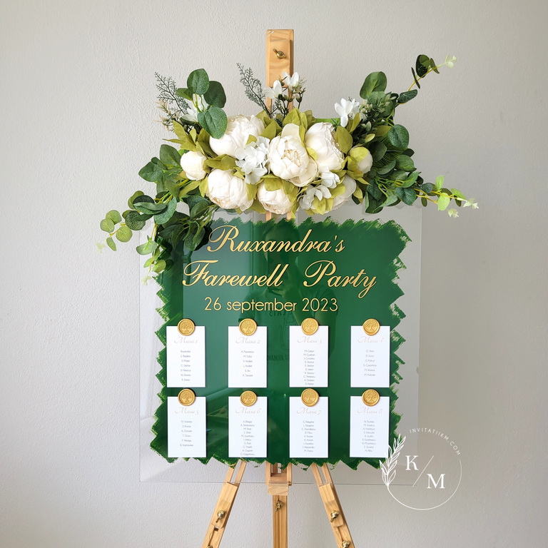 Panou de intampinare pentru botez cu cartonase cu asezarea invitatilor la mese. Panoul este realizat din plexiglas transparent vopsit in diverse culori pe verso, are dimensiunea 50 x 50 cm, iar cartonasele sunt realizate din carton alb neted + sigiliu. In functie de numarul cartonaselor, acestea pot fi mai mari/mai micute. Se pot achizitiona impreuna sau separat.