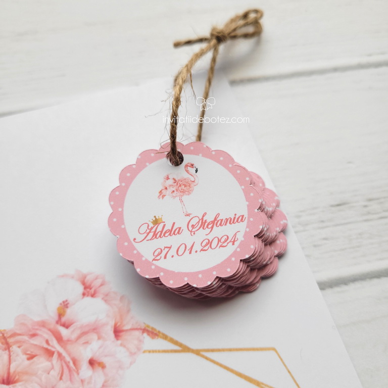Etichete pentru marturii de botez cu flamingo si flori roz. Etichetele pentru marturii sunt realizate din carton alb neted si pot fi cu gaurica sau autocolante, de lipit. Dimensiunea si grafica se pot personaliza.