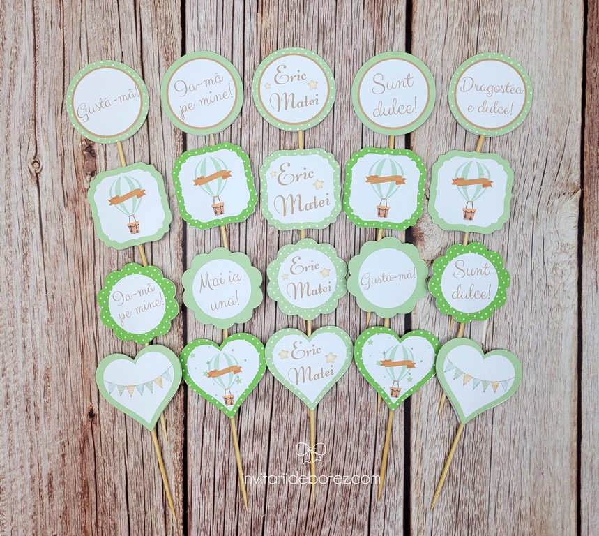 Mesaje candy bar/propsuri pentru candy bar in nuante de verde, cu numele baiatului si baloane cu aer cald. Mesajele pentru prajituri sunt realizate din doua cartonase lipite si un betitsor si pot fi personalizate.