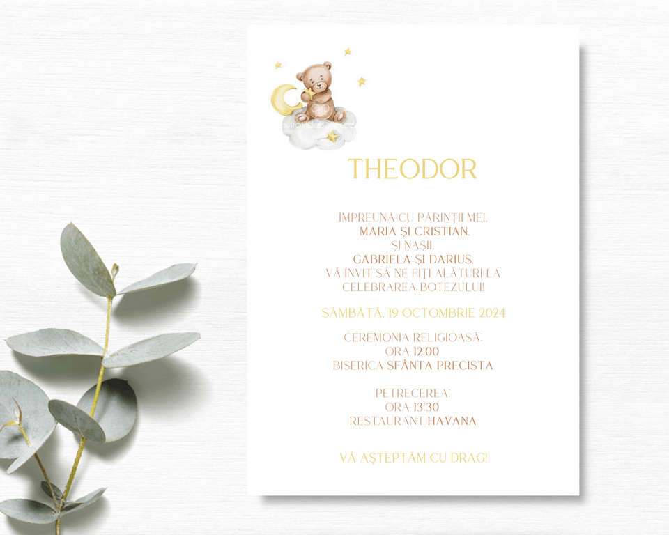 Invitatii de botez minimaliste cu ursulet, pentru baiat. Invitatiile de botez sunt realizate din carton alb neted, print cu ursulet pe norisor si stelute, cu text simplu ce poate fi personalizat, accesorizate cu un plic colorat premium. Invitatia de botez cu ursulet se poate realiza si numai in format digital (tip imagine).