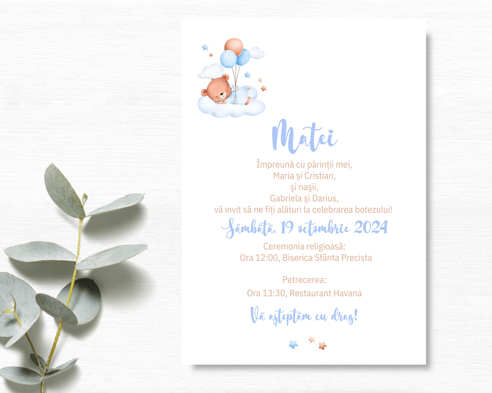 Invitatii de botez minimaliste cu ursulet, pentru baietel. Invitatiile de botez sunt realizate din carton alb neted, print cu ursulet pe norisor, baloane bleu si maro si stelute, cu text simplu ce poate fi personalizat, accesorizate cu un plic colorat premium. Invitatia de botez cu ursulet se poate realiza si numai in format digital (tip imagine).