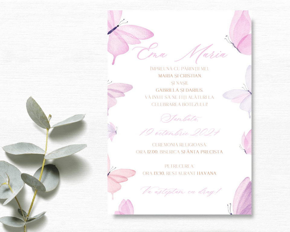 Invitatii de botez minimaliste cu fluturi colorati, pentru fetita. Invitatiile de botez sunt realizate din carton alb neted, print cu fluturasi in nuante pastelate de roz, piersica, mov, cu text simplu ce poate fi personalizat, accesorizate cu un plic colorat premium. Invitatia de botez cu fluturi se poate realiza si numai in format digital (tip imagine).