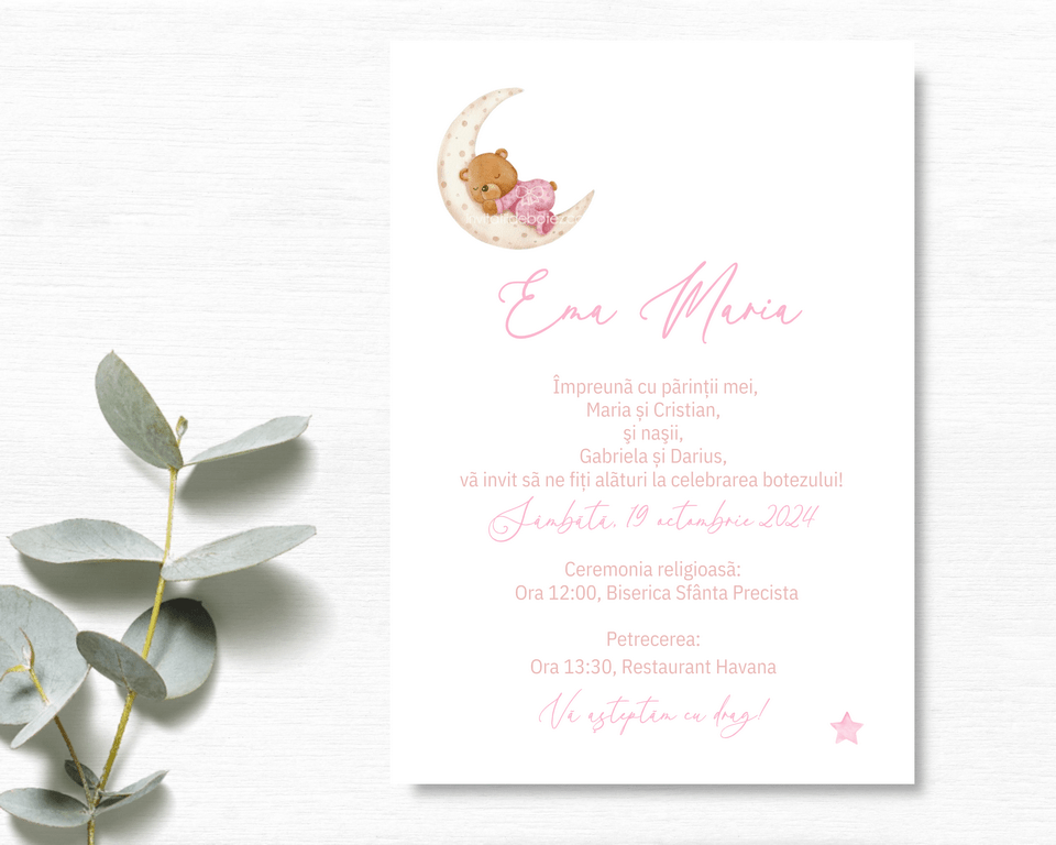 Invitatii de botez minimaliste cu ursulet, pentru fetita. Invitatiile de botez sunt realizate din carton alb neted, print cu ursulet in pijama dormin pe luna, cu text simplu ce poate fi personalizat, accesorizate cu un plic colorat. Invitatia de botez cu ursulet se poate realiza si numai in format digital (tip imagine).