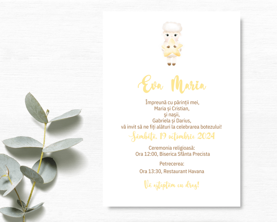 Invitatii de botez minimaliste cu oita si steluta, pentru fetita. Invitatiile de botez sunt realizate din carton alb neted, print cu oita draguta si steluta galbena, cu text simplu ce poate fi personalizat, accesorizate cu un plic colorat. Invitatia de botez cu oita se poate realiza si numai in format digital (tip imagine).